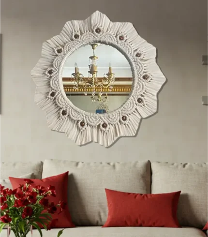 مرآة مكرمية من براند خيوط مصنوعة يدويًا باستخدام الألياف وزجاج، بتصميم بسيط مميز ولون ابيض أنيق. تضيف لمسة طبيعية وفنية لغرفة النوم أو المعيشة. مناسبة لمساحات بمقاس 30×40 سم.