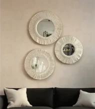مرآة مكرمية 3 قطع من براند خيوط مصنوعة يدويًا باستخدام الألياف وزجاج، بتصميم بوهيمي مميز ولون ابيض أنيق. تضيف لمسة طبيعية وفنية لغرفة النوم أو المعيشة. مناسبة لمساحات بمقاس 50×40 سم.