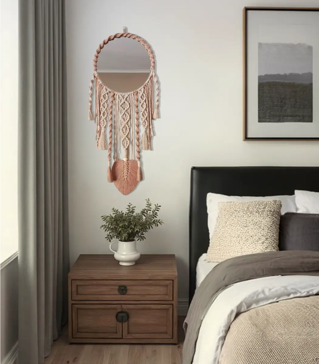 مرآة مكرمية من براند خيوط مصنوعة يدويًا باستخدام الألياف وزجاج، بتصميم بوهيمي مميز و متعددة الالوان المميزة. تضيف لمسة طبيعية وفنية لغرفة النوم أو المعيشة. مناسبة لمساحات بمقاس 30×80 سم.