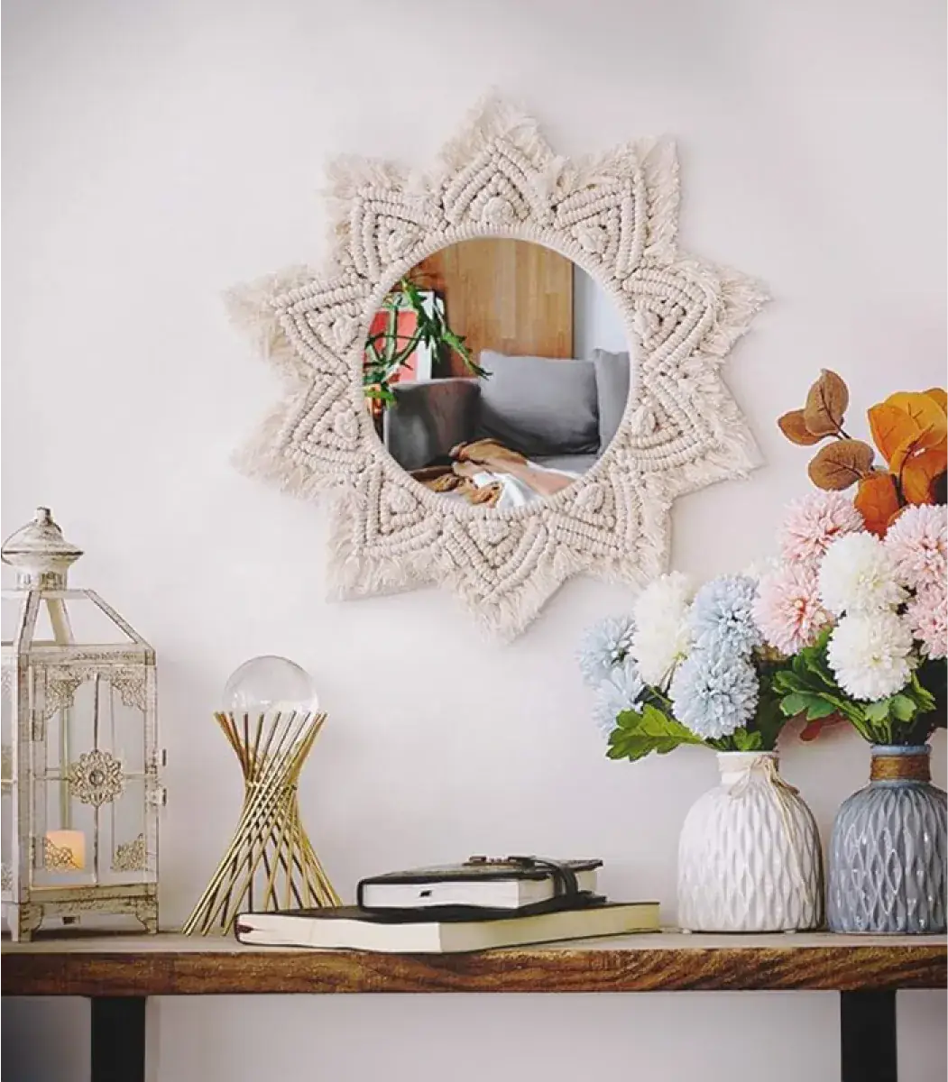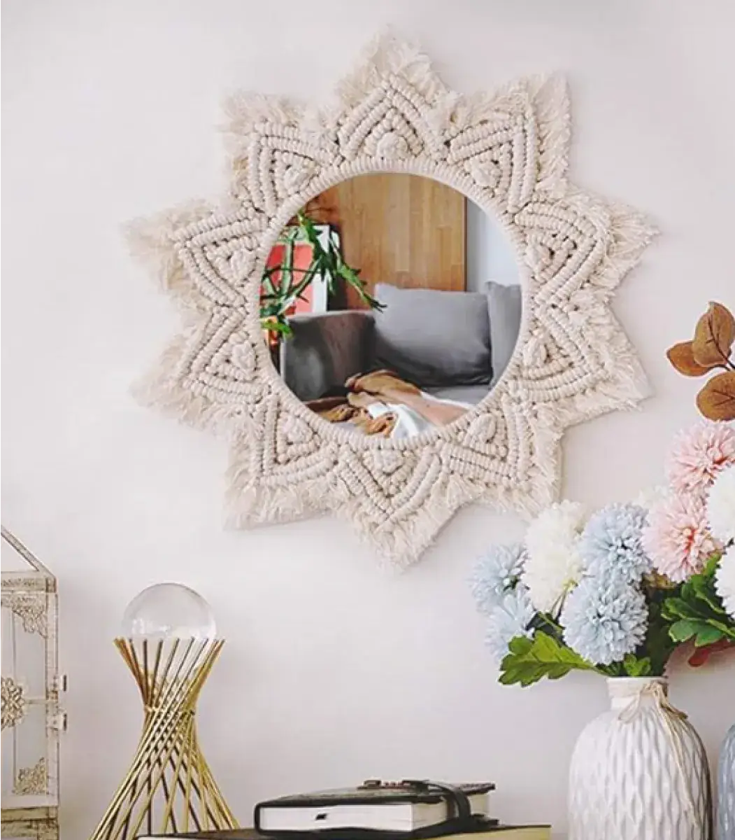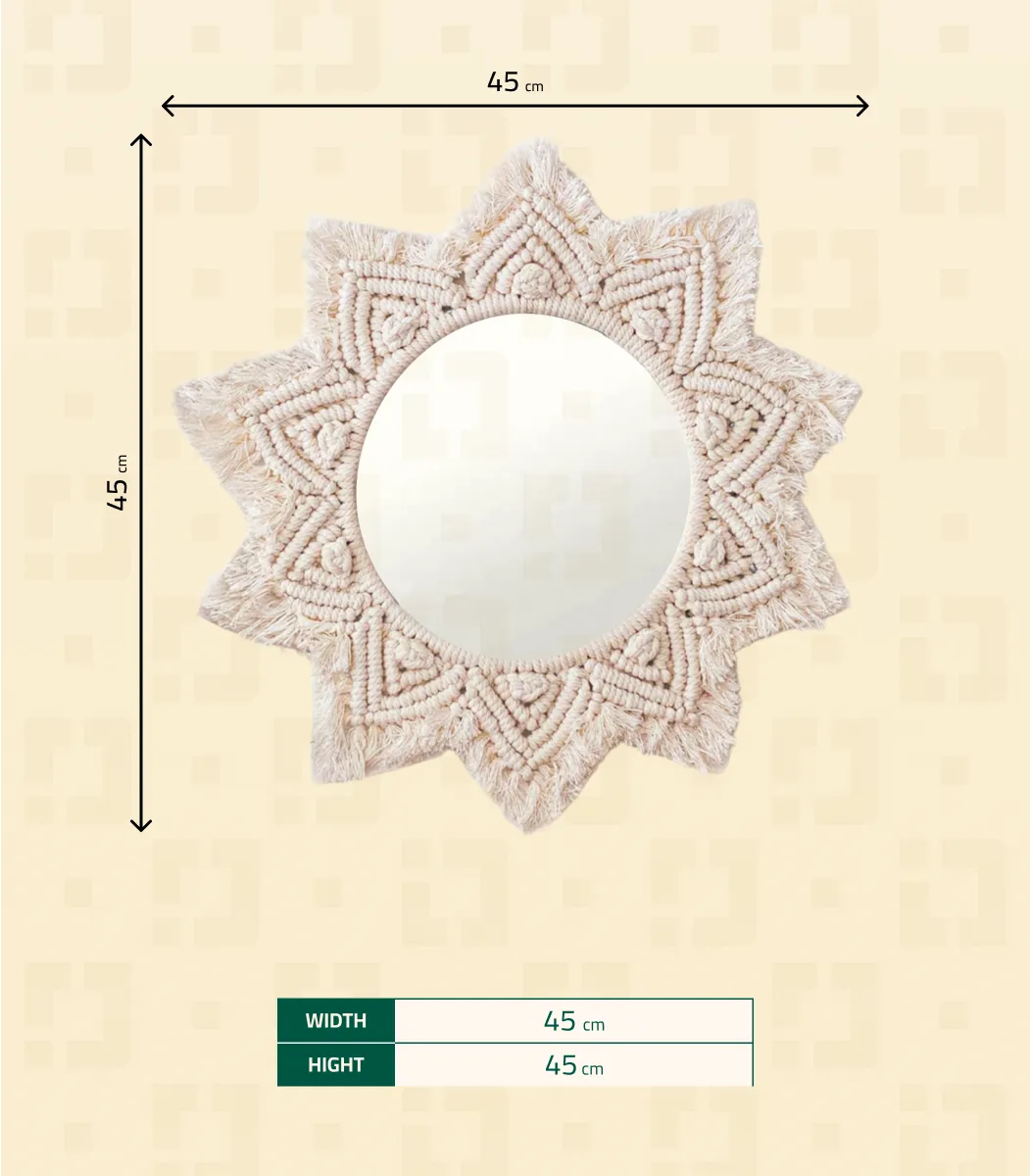 مرآة مكرمية من براند أنتيكيانو مصنوعة يدويًا باستخدام الألياف و زجاج، بتصميم ريفي، حديث، بوهيمي، كلاسيكي، بسيط مميز ولون اوف وايت أنيق. تضيف لمسة طبيعية وفنية لغرفة النوم أو المعيشة. مناسبة لمساحات بمقاس 45×45 سم.