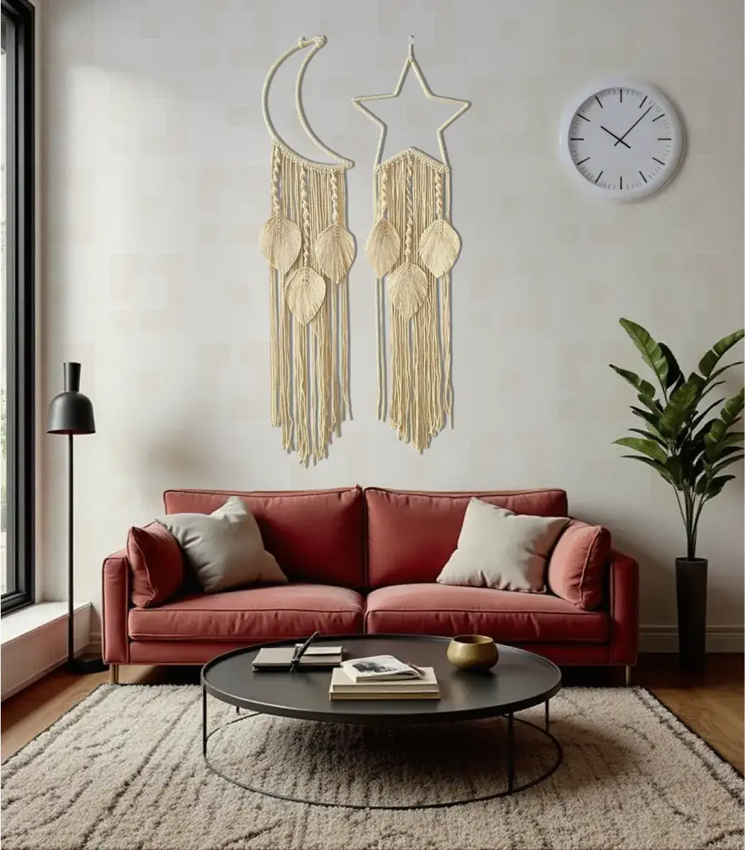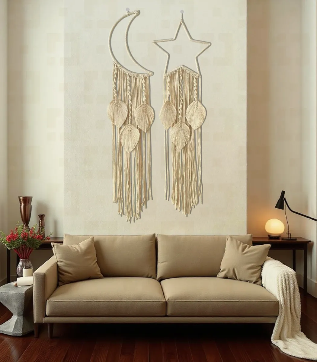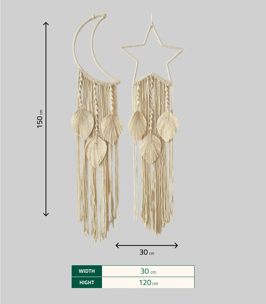 مكرمية رمضان صناعة يدوية من خامات الطبيعة، هلال رمضان ونجمة مكرمية بيج من الألياف والمعادن، 120*30 سم، صنع بواسطة Decoro، يناسب النمط البوهيمي، مستوحى من التصميم الانيق لمحبي المشغولات اليدوية، باستخدام مواد عالية الجودة، تضيف لمسة من الأناقة و الجمال إلى أى مساحة.