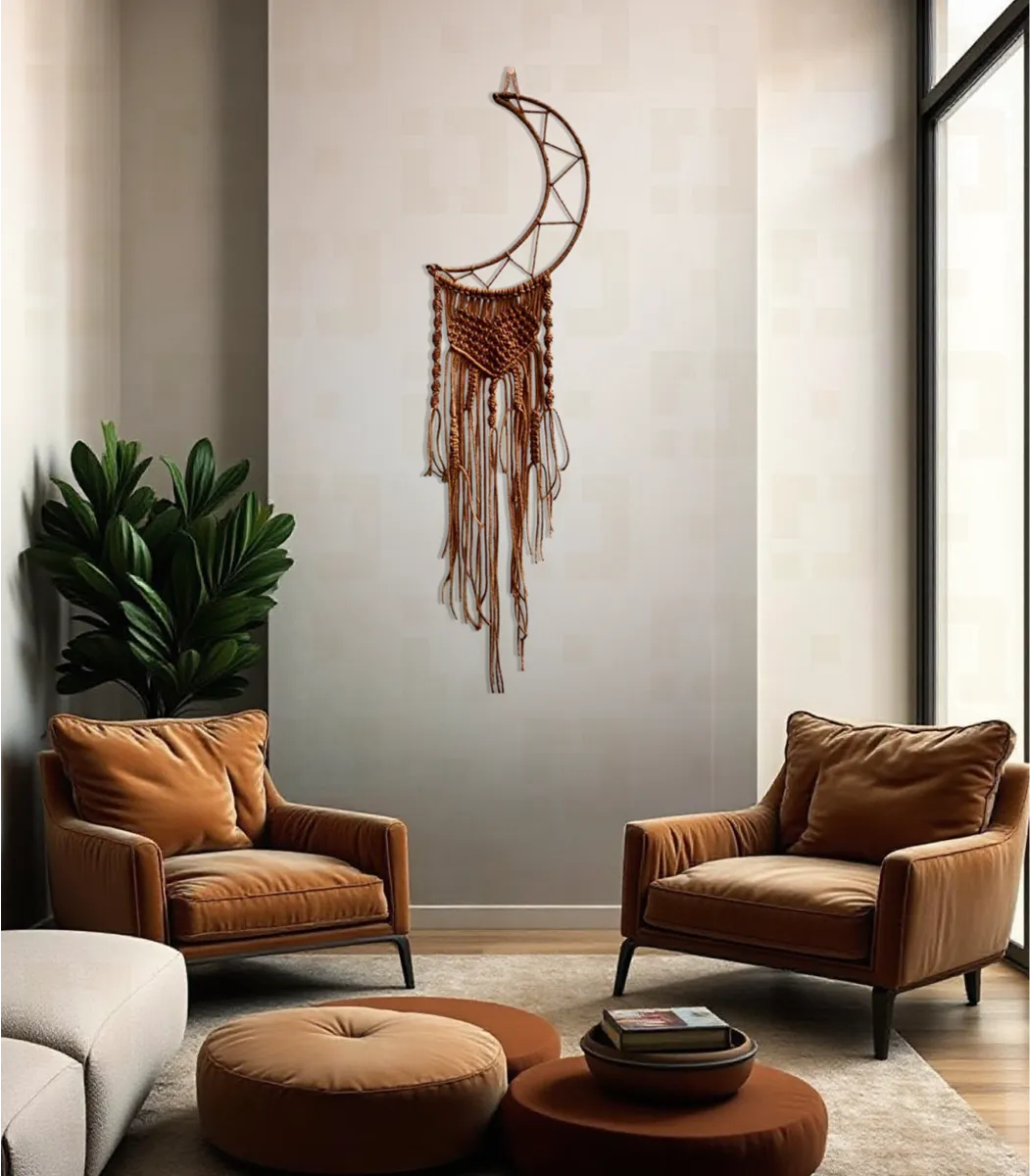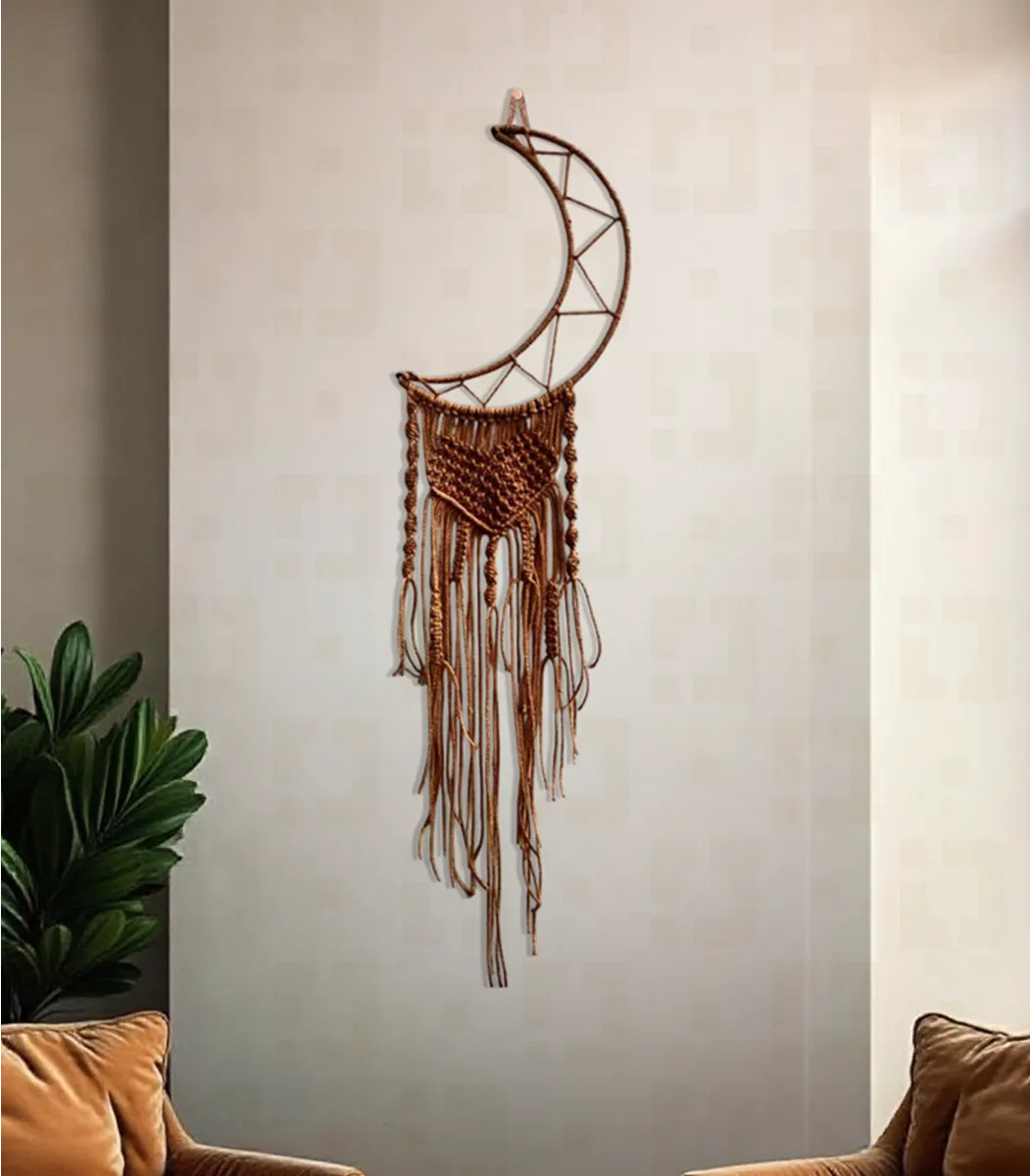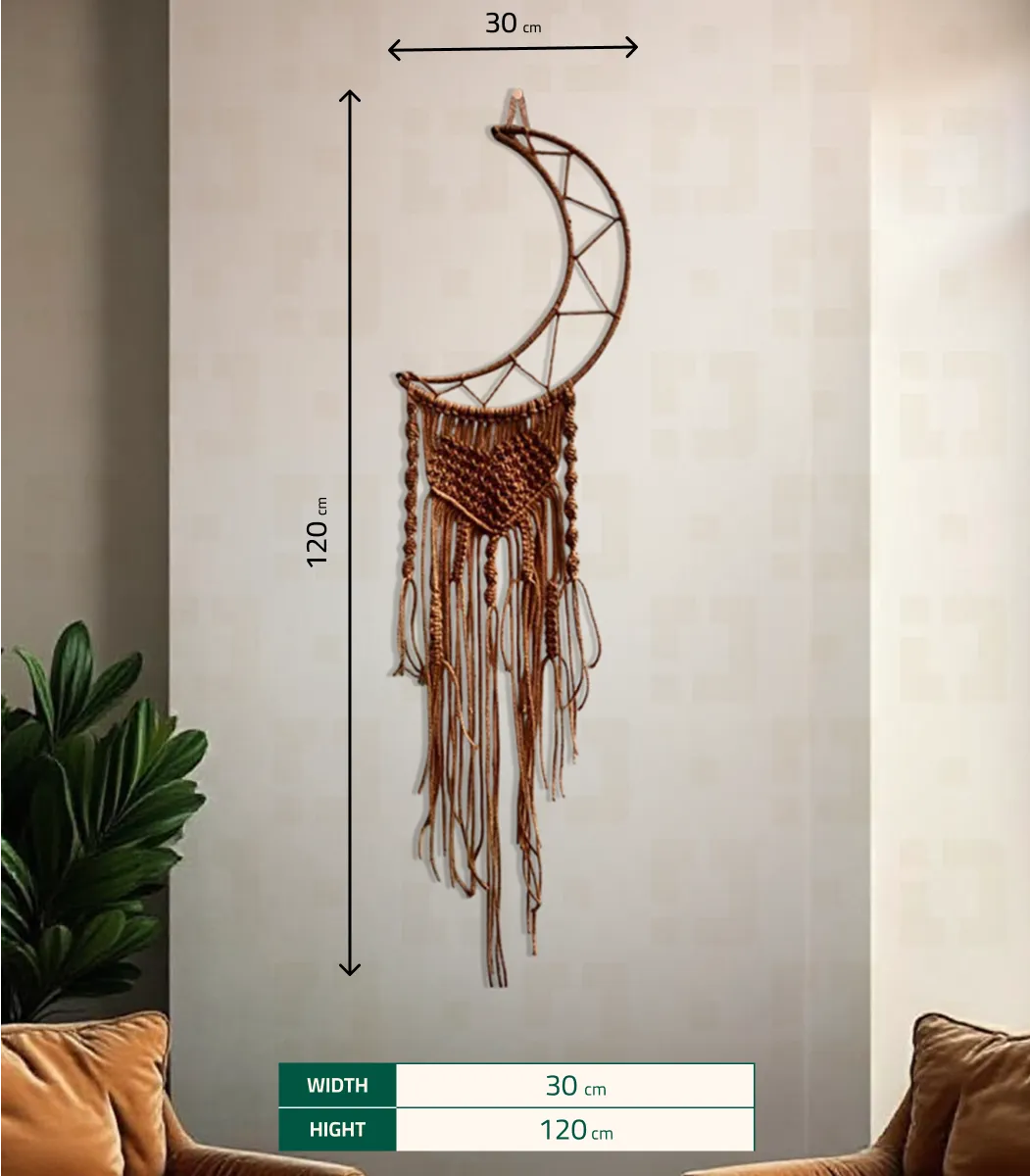 مكرمية رمضان صناعة يدوية من خامات الطبيعة، هلال مكرمية بنى من الألياف والمعادن، 120*30 سم، صنع بواسطة LAMSA، يناسب النمط ريفي، مستوحى من التصميم الانيق لمحبي المشغولات اليدوية، باستخدام مواد عالية الجودة، تضيف لمسة من الأناقة و الجمال إلى أى مساحة.