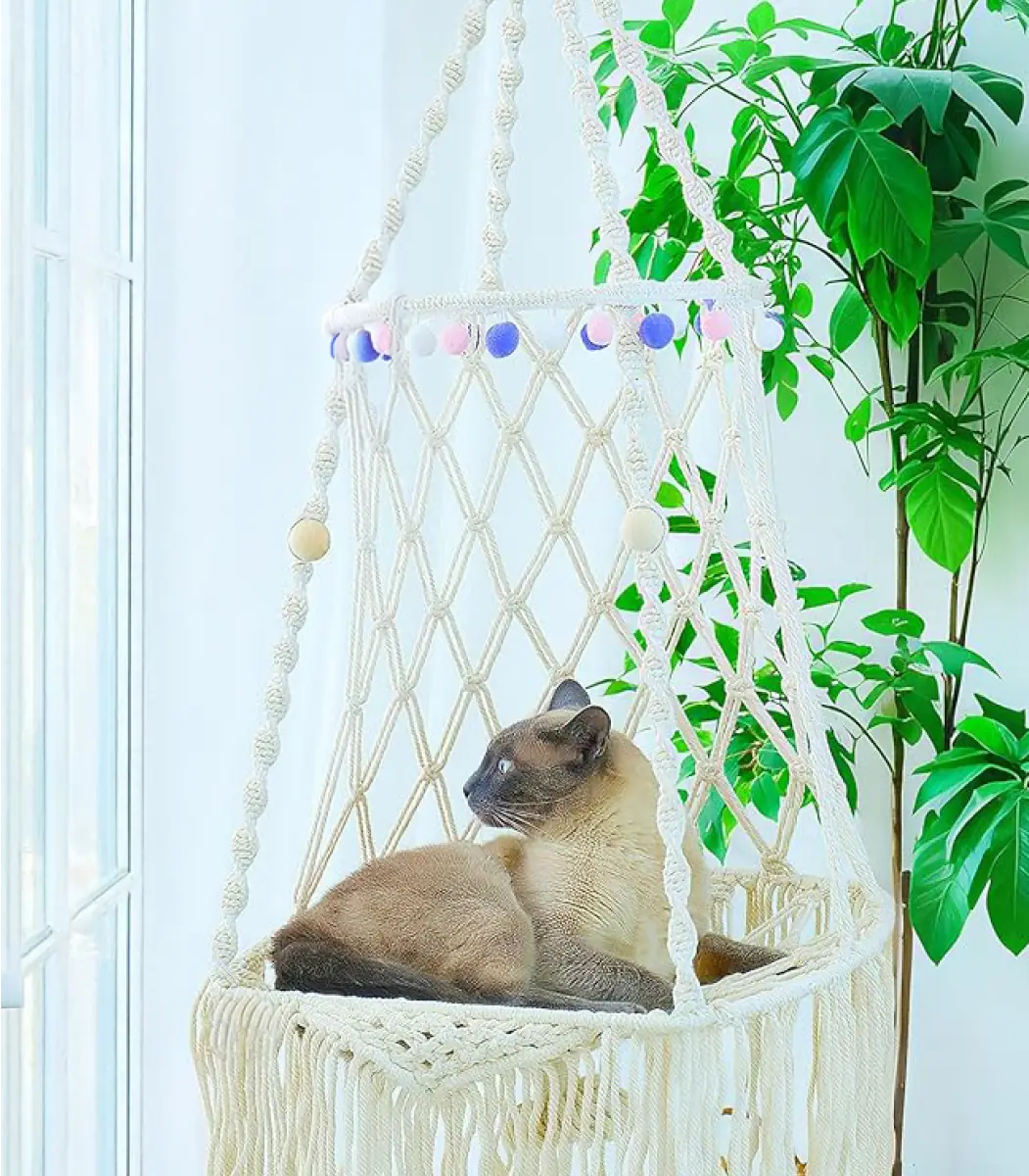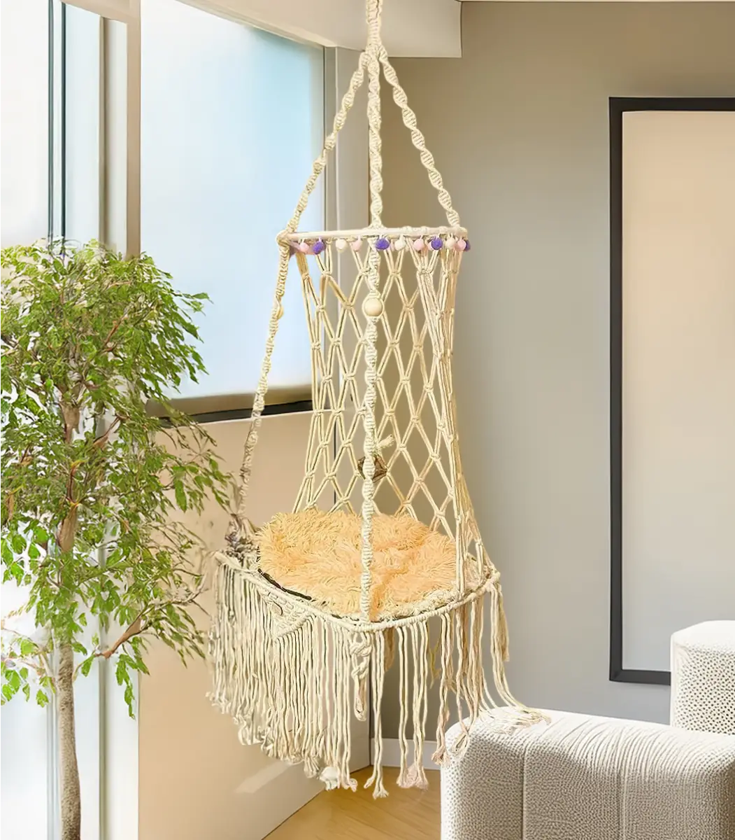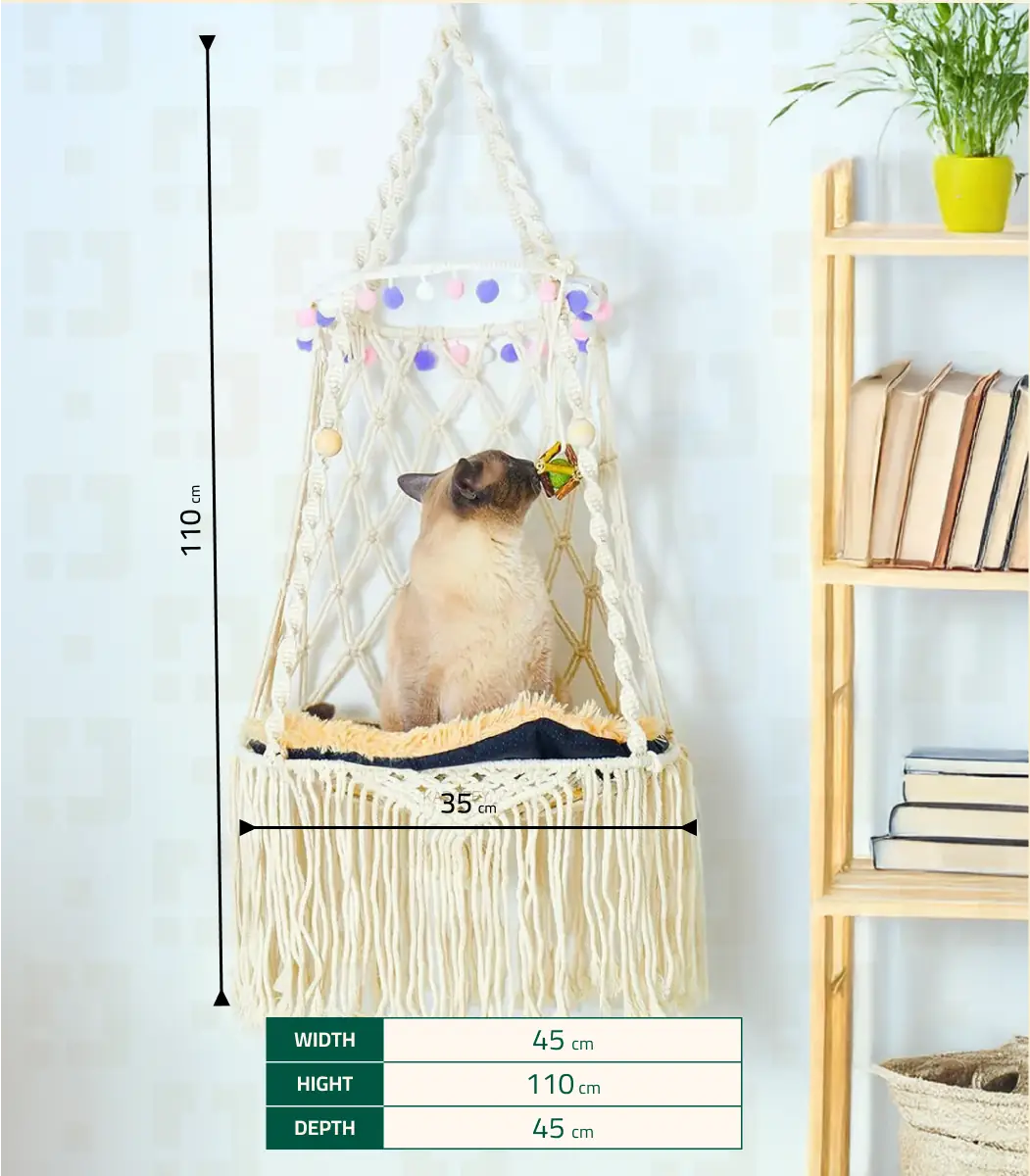 أضف لمسة من الراحة والأناقة لحيوانك الأليف مع أرجوحة قطط معلقة من المكرمية من Khoyot, مصنوع من الألياف والمعادن بلون اوف وايت، بقياس 110 x 45 x 45 سم, بتصميم بوهيمي يضيف طابع مميز لأي مساحة داخل منزلك.