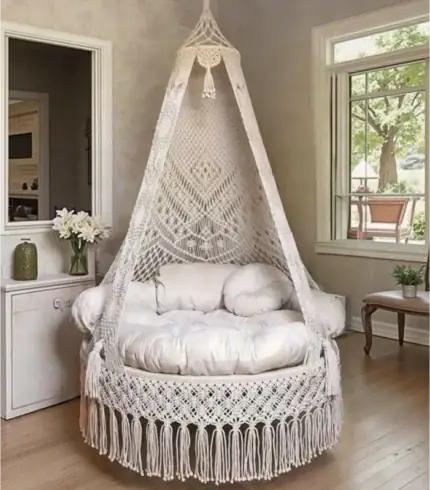أضف لمسةً مميزةً إلى مساحتك الداخلية أوالخارجية مع أرجوحة مكرمية خشبية المصنوعة يدويًا من براند خيوط. مصنوع بعناية من مواد خشب،الياف ومصمم بأسلوب بوهيمي، ولون اوف وايت يمتزج مع أي مكان. سواءً عُرض في غرفة المعيشة، أو غرفة النوم، أو الشرفة، أو في الحديقة، فإنه يضفي عليه لمسةً من الدفء والحرفية. حجمه مثالي للمناطق التي يبلغ حجمها 150×60 سم.