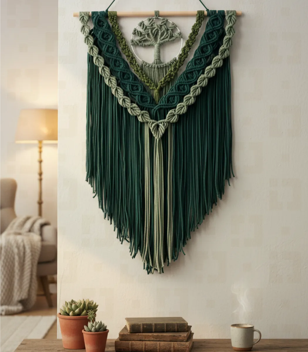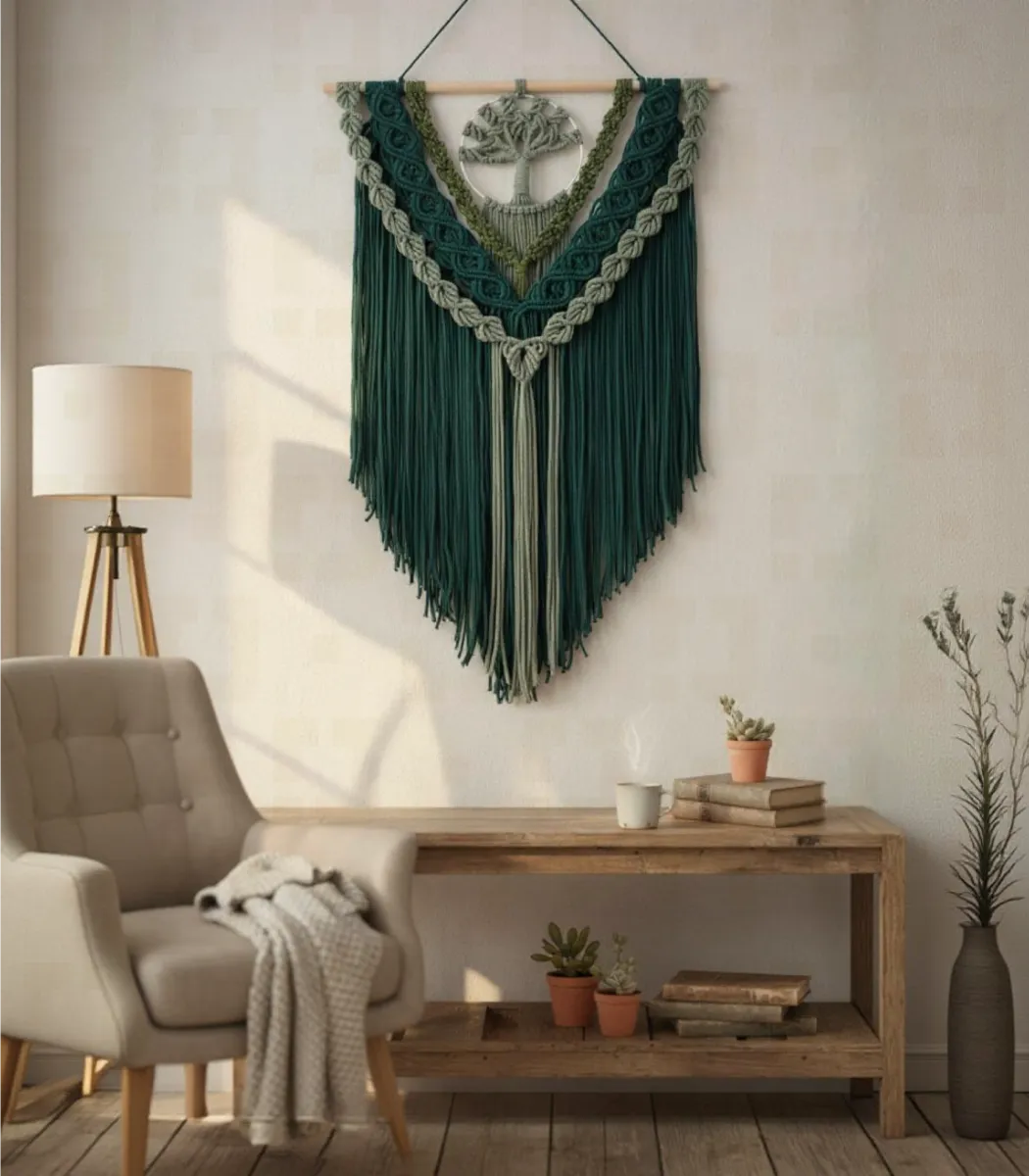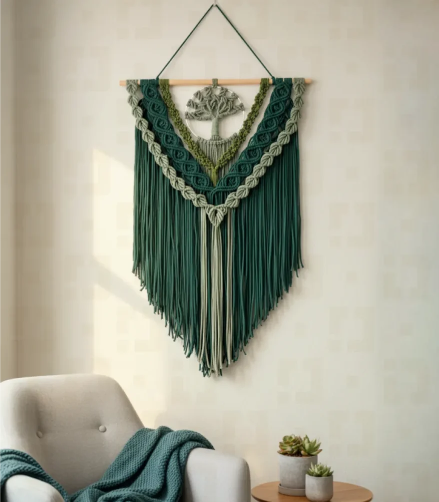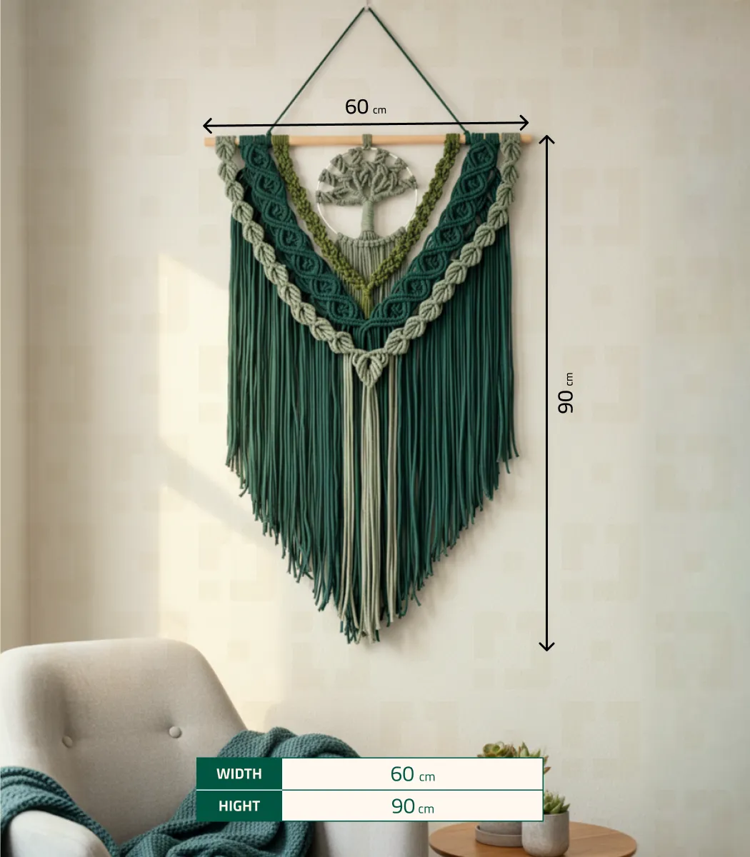 أحيانًا، كل ما تحتاجه غرفتك هو قطعة واحدة لتشعر بالاكتمال. هذه ديكورات حائط مكرمية المصنوعة يدويًا من براند Decoro يُلبي هذا تمامًا. صُمم بعناية باستخدام الألياف والخشب، وبنمط ريفي، حديث، بوهيمي، كلاسيكي، بسيط وبلون اخضر، ليُشكل نقطة محورية أنيقة تنسجم بسلاسة مع التصميمات الداخلية الفريدة والطبيعية. مقاسه 90×50 سم.