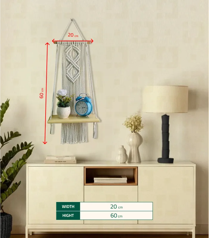 أضف لمسة من الدفء والتميز إلى حائطك مع رف مكرمية من براند Home Accessories. مصنوع من خشب،الياف بجودة عالية وبأسلوب بوهيمي أنيق، يأتي بلون اوف وايت ليتناسب مع مختلف أنماط الديكور. مثالي لغرف المعيشة أو النوم أو مداخل المنزل، ويضفي لمسة طبيعية وجمالية مصنوع خصيصاً لك. مناسب لمساحة بمقاس 60×20 سم.