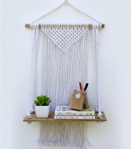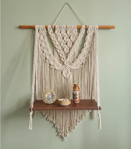 أنتيكيانو بتبدأ الحكاية بلمسة من الفن في رف مكرمية handmade المصنوع بإتقان. مصنوع يدويًا من الألياف والخشب الطبيعي بلون بيج ناعم يعبّر عن البساطة والفخامة. تحفة فنية تضيف لمسة دفء وجمال لكل ركن.