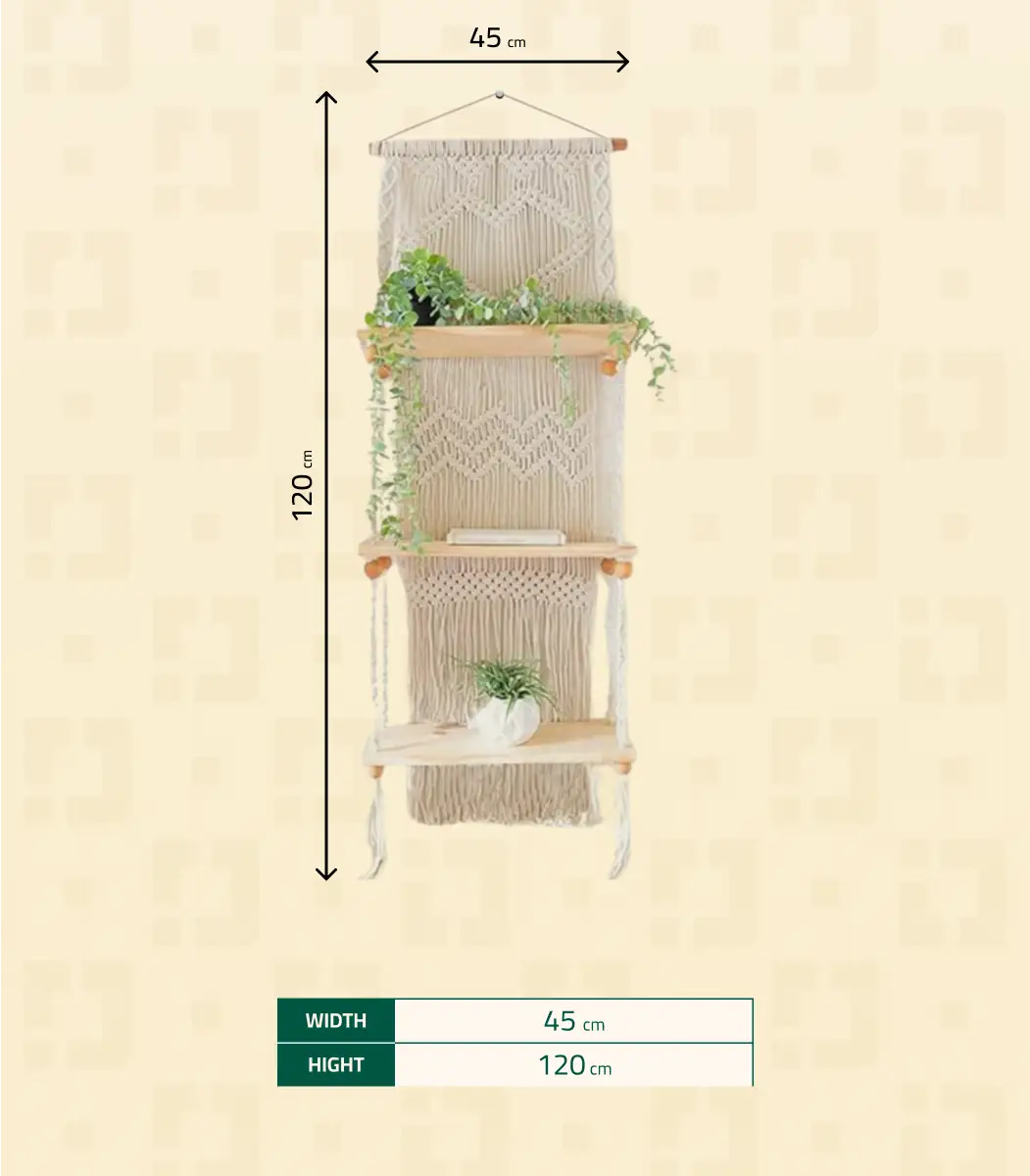 أضف لمسة من الدفء والتميز إلى حائطك مع رف مكرمية من براند أنتيكيانو. مصنوع من الألياف والخشب بجودة عالية وبأسلوب بوهيمي أنيق، يأتي بلون بيج ليتناسب مع مختلف أنماط الديكور. مثالي لغرف المعيشة أو النوم أو مداخل المنزل، ويضفي لمسة طبيعية وجمالية مصنوع خصيصاً لك. مناسب لمساحة بمقاس 45×120 سم.