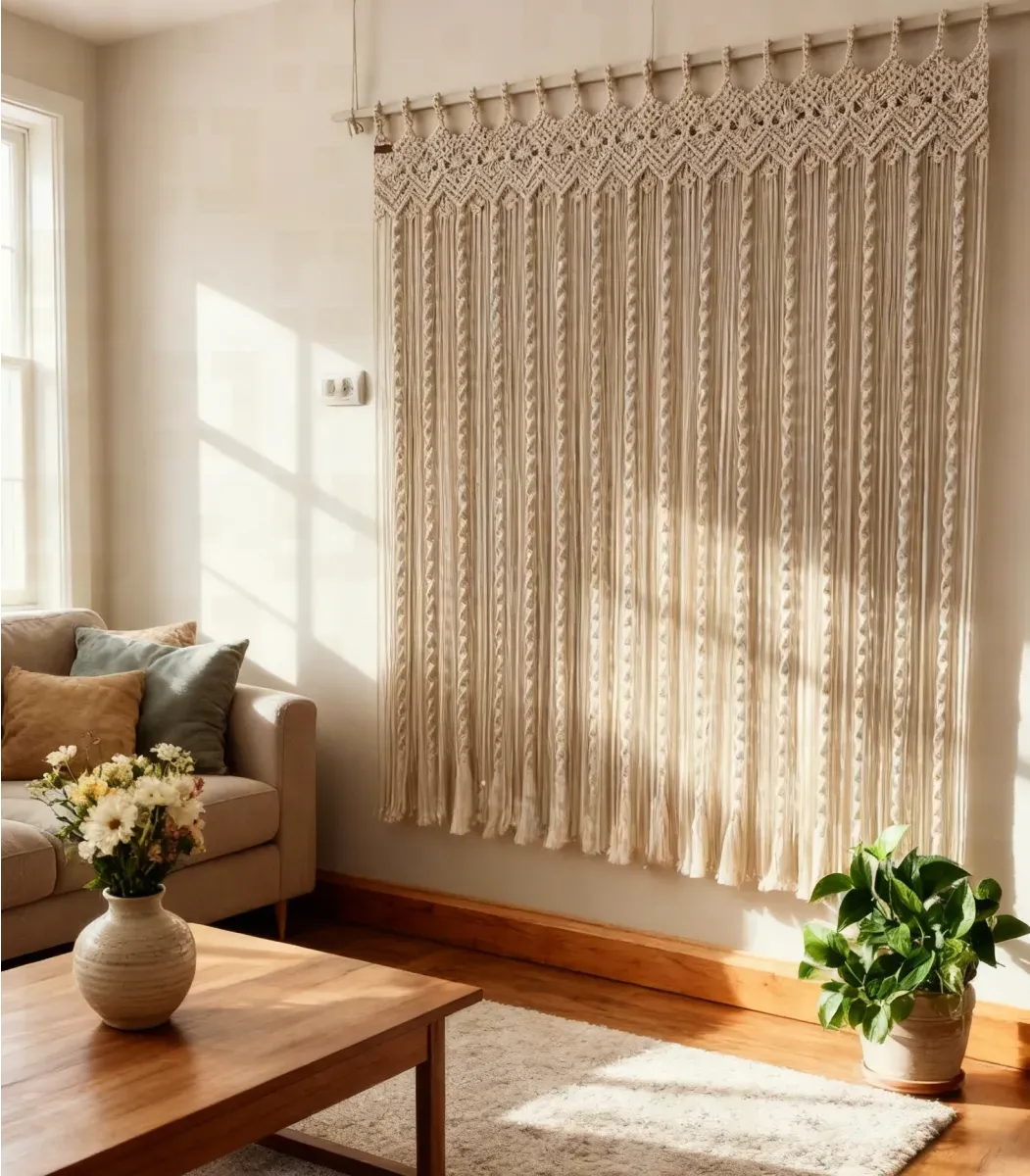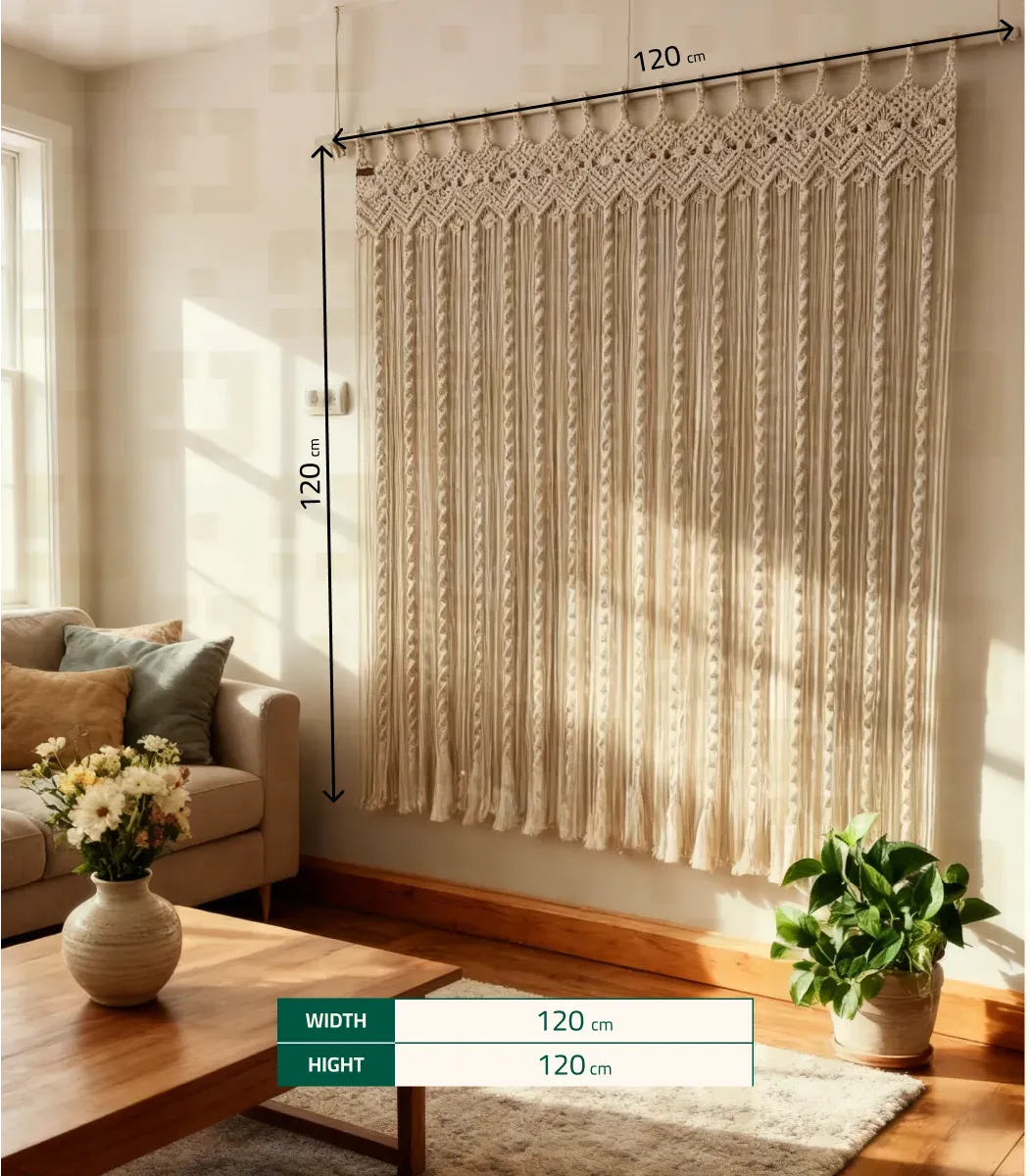 ارتقِ بديكور منزلك بفضل ستارة مكرمية المصنوع بحرفية عالية. مصنوع يدويًا من ألياف، باللون اوف وايت، وبمقاس 120*120 سم. قطعة ديكور مثالية تضيف لمسة من الجمال والدفء لأي مساحة.
