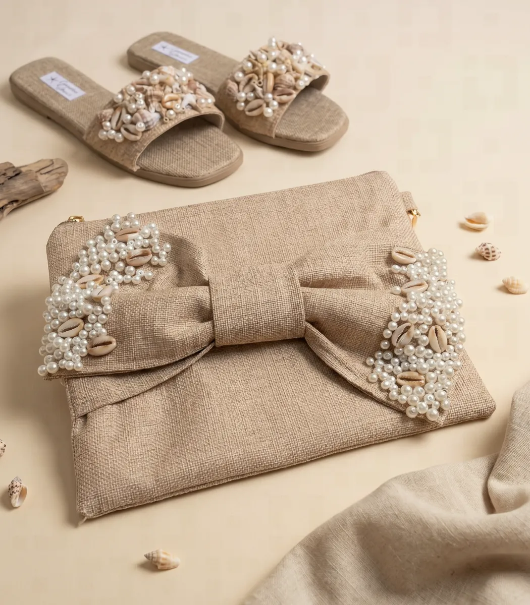 ثنائي منتقى بعناية نابع من إتقان Art craft لفن الألياف – طقم حقيبة اليد والشبشب هذا ينسج نسيجًا غنيًا من الألوان والقوام يعيد تعريف الأناقة البوهيمية في أكثر أشكالها فخامة.