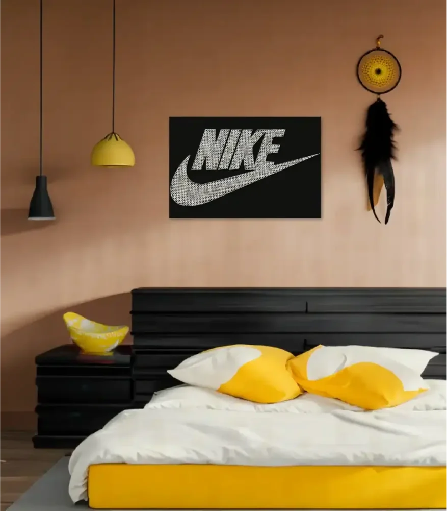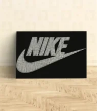 فن الخيوط الشعارات العلامات التجارية الشهيرة، فن معاصر مصنوع يدوياً، لوحة فنية للحائط بتصميم شعار نايك باستخدام مواد خام عالية الجودة، متوفر بألوان ابيض و اسود.