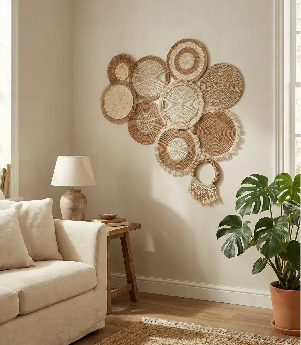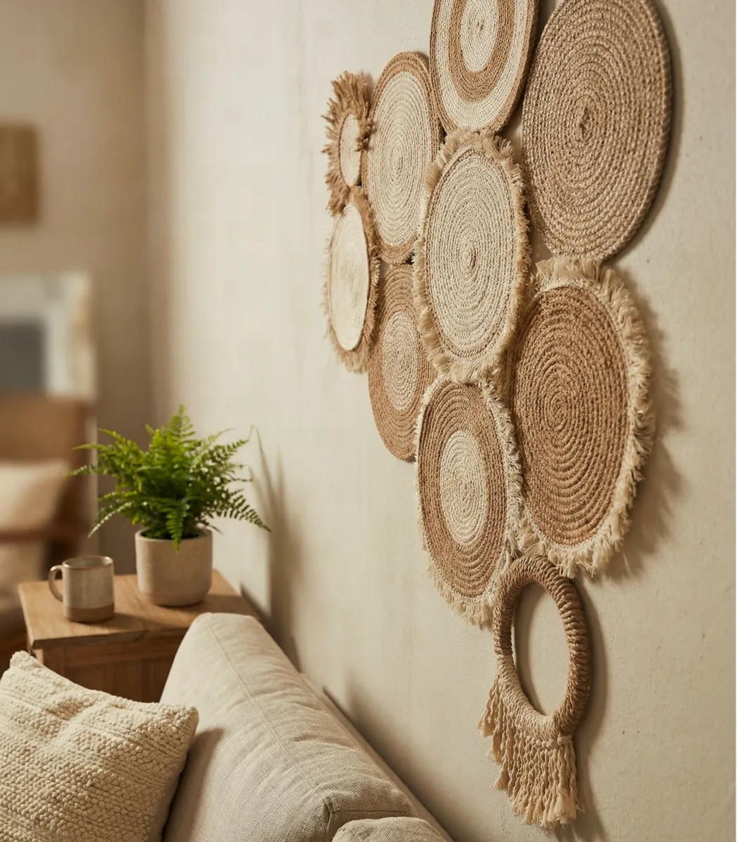 عشر قطع، أجواء لا متناهية. طقم حائط HANDS Boho هذا تحفة فنية في فن تنسيق الديكور البوهيمي، حيث تُساهم كل قطعة مصنوعة يدويًا من الألياف والخشب في خلق لوحة متعددة الألوان تتغير مع الضوء وتزداد عمقًا مع كل نظرة. لجدران تُصمم لتُعاش، لا لتُرى فقط.