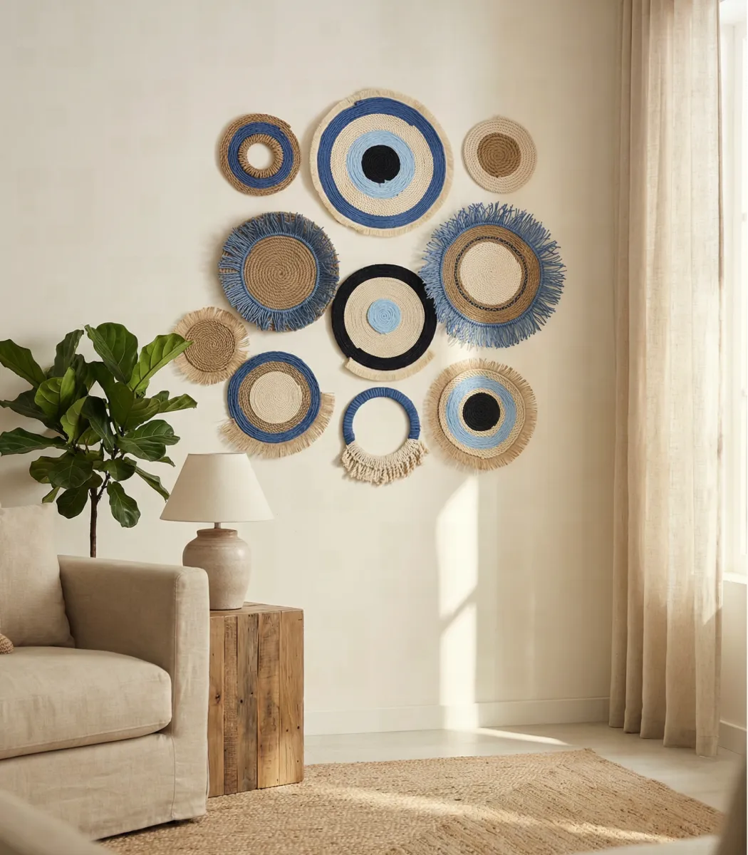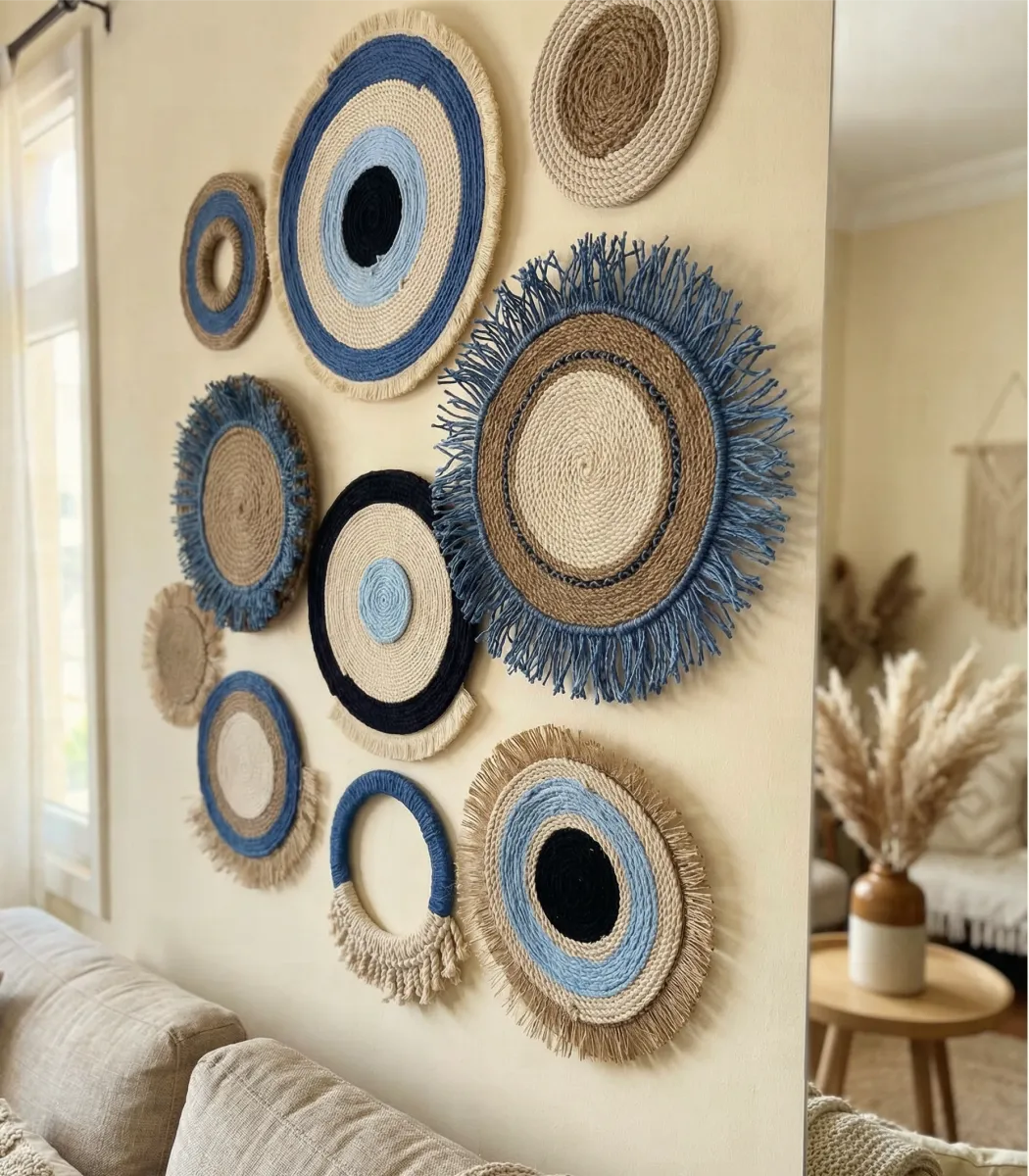 إبداعٌ فنيٌّ فائق. تُقدّم HANDS عشر قطعٍ مصنوعةٍ يدويًا في مجموعة جدارية بوهيمية متكاملة – عملٌ فنيٌّ متعدد الألوان من الألياف والخشب، يملأ الجدار بجمالٍ متداخل لا يُضاهى إلا بالحرف اليدوية. تعبيرٌ عن ثقةٍ إبداعيةٍ للديكورات الداخلية الجريئة.