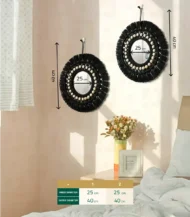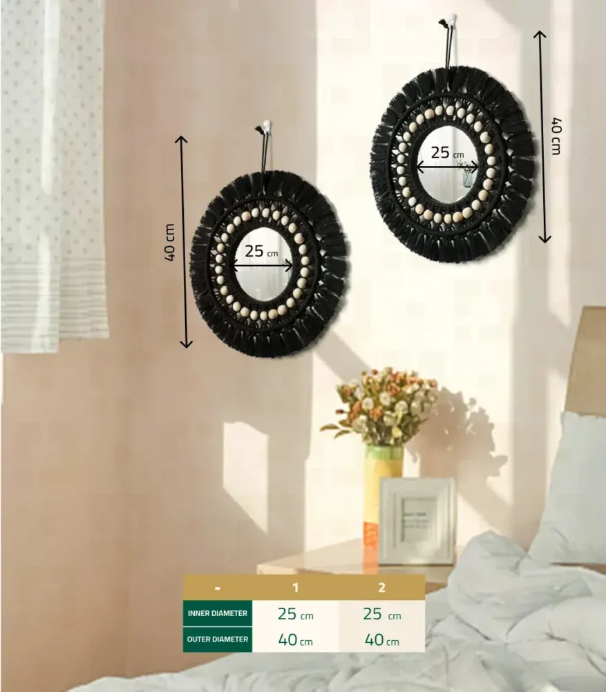 مرآة مكرمية قطعتين من براند خيوط مصنوعة يدويًا باستخدام الألياف وزجاج، بتصميم كلاسيكي مميز ولون اسود أنيق. تضيف لمسة طبيعية وفنية لغرفة النوم أو المعيشة. مناسبة لمساحات بمقاس 25×40 سم.