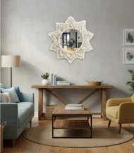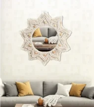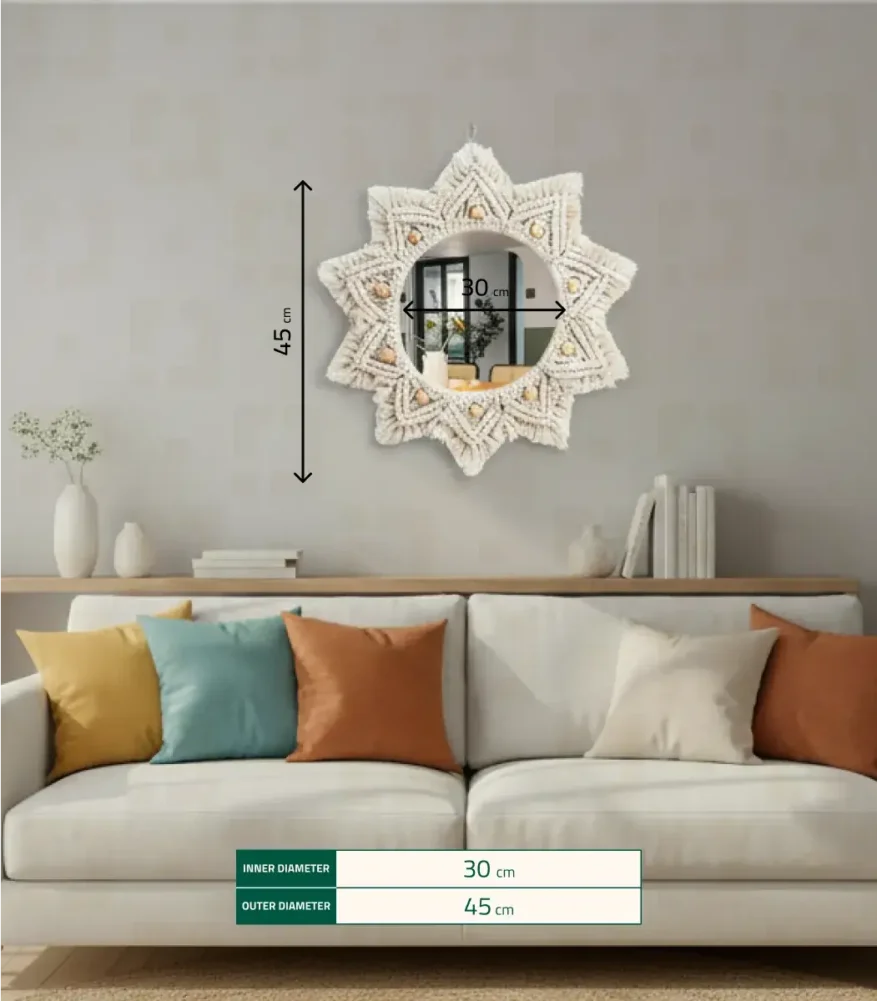 مرآة مكرمية من براند خيوط مصنوعة يدويًا باستخدام الألياف وزجاج، بتصميم بوهيمي مميز ولون ابيض أنيق. تضيف لمسة طبيعية وفنية لغرفة النوم أو المعيشة. مناسبة لمساحات بمقاس 30×45 سم.