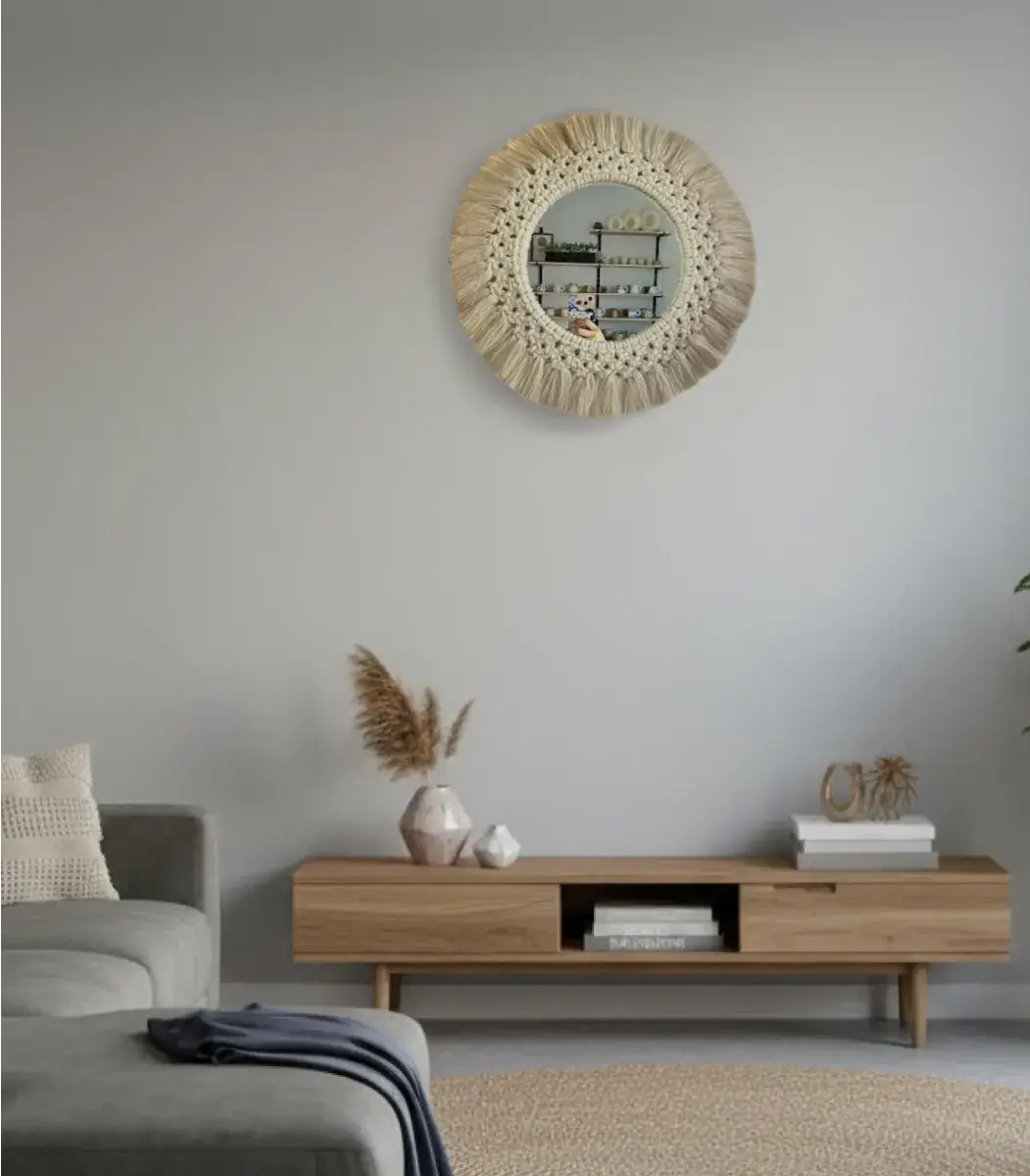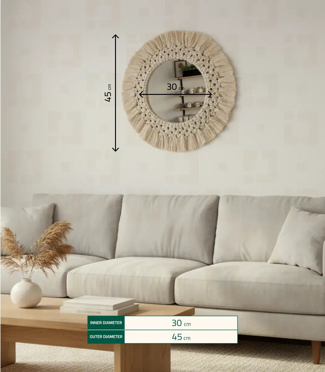 مرآة مكرمية من براند خيوط مصنوعة يدويًا باستخدام الألياف وزجاج، بتصميم حديث مميز ولون اوف وايت أنيق. تضيف لمسة طبيعية وفنية لغرفة النوم أو المعيشة. مناسبة لمساحات بمقاس 30×45 سم.