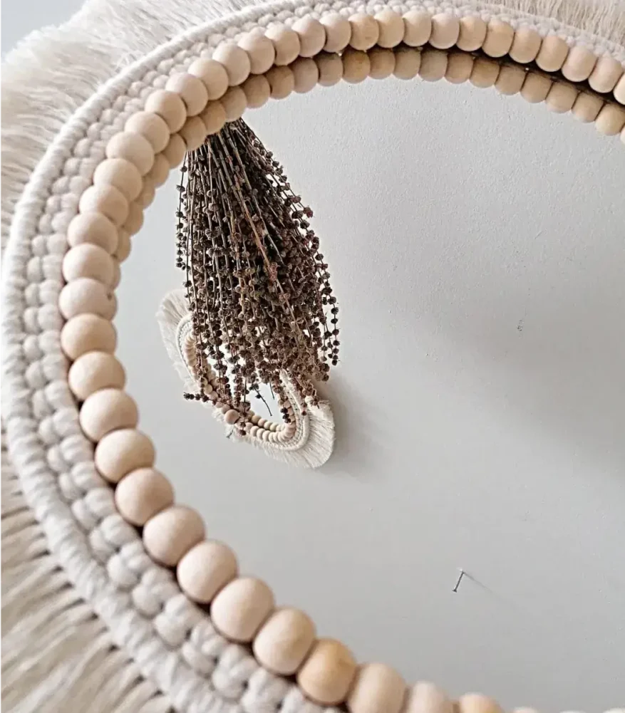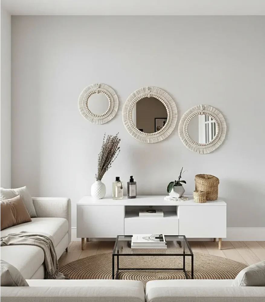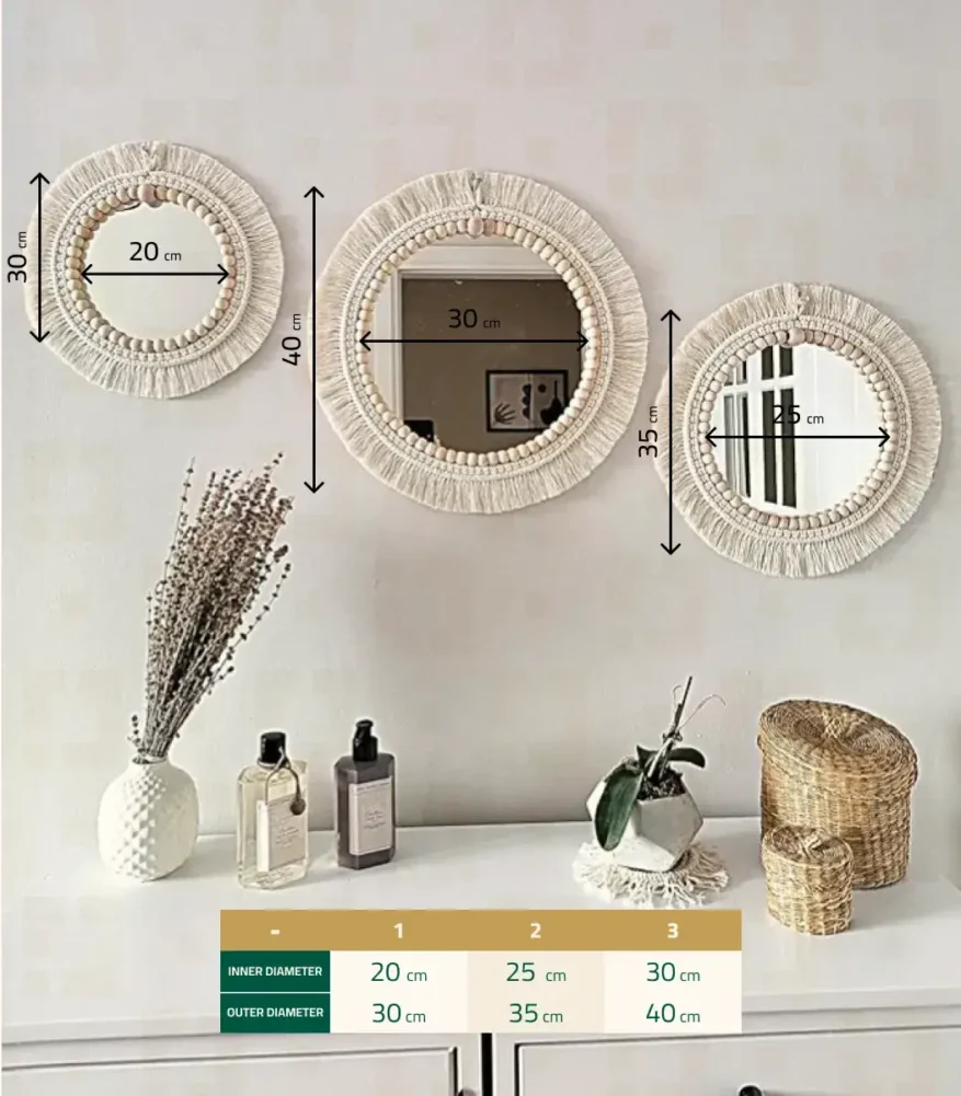 مرآة مكرمية 3 قطع من براند خيوط مصنوعة يدويًا باستخدام الألياف وزجاج، بتصميم حديث مميز ولون اوف وايت أنيق. تضيف لمسة طبيعية وفنية لغرفة النوم أو المعيشة. مناسبة لمساحات بمقاس 30×40 سم.