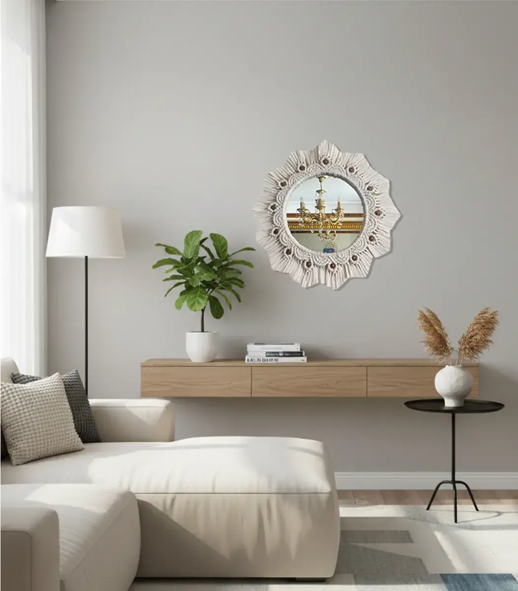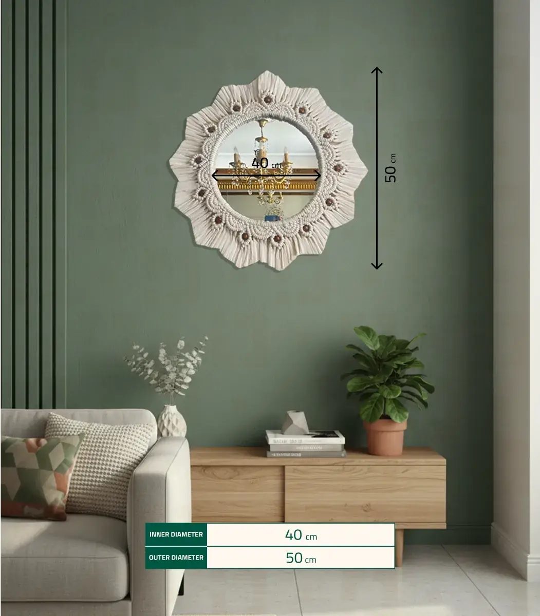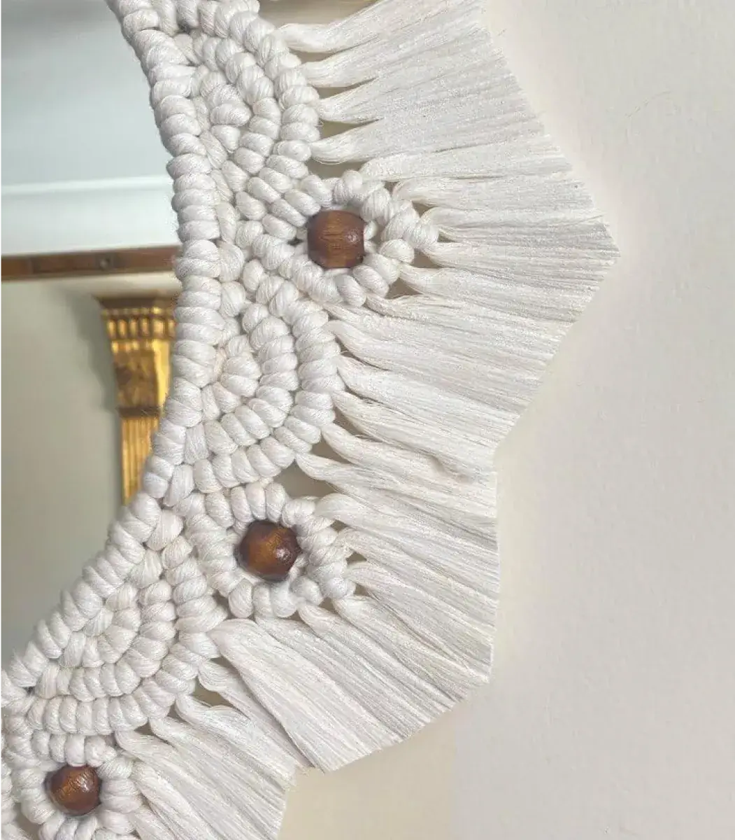 مرآة مكرمية من براند خيوط مصنوعة يدويًا باستخدام الألياف وزجاج، بتصميم بوهيمي مميز ولون ابيض أنيق. تضيف لمسة طبيعية وفنية لغرفة النوم أو المعيشة. مناسبة لمساحات بمقاس 50×40 سم.
