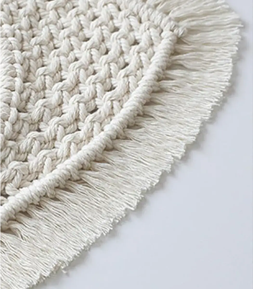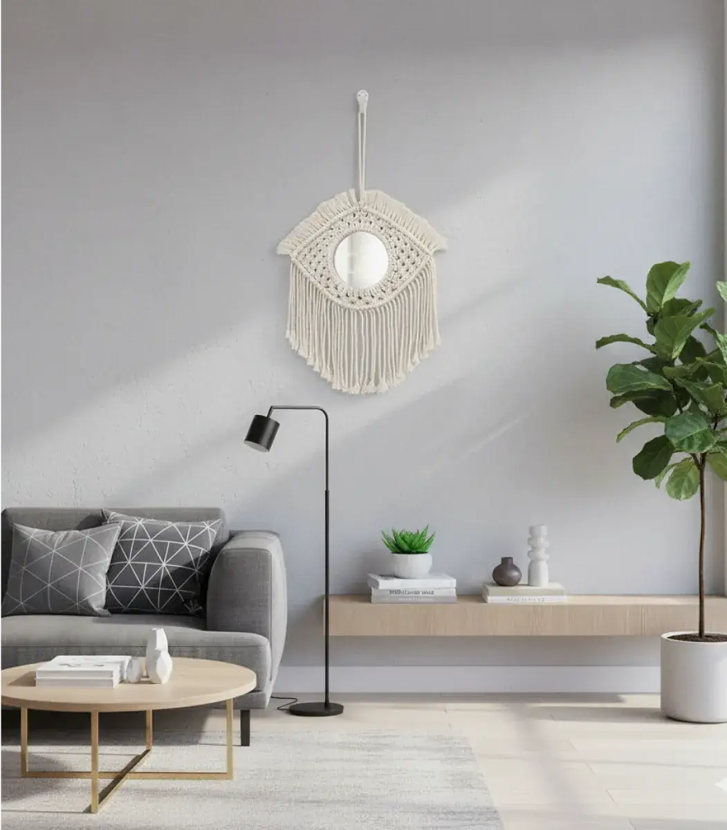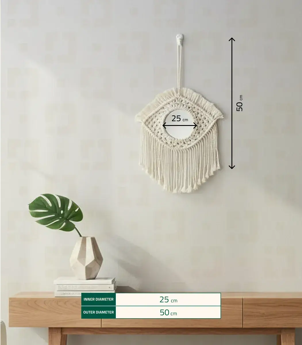 مرآة مكرمية من براند خيوط مصنوعة يدويًا باستخدام الألياف وزجاج، بتصميم بوهيمي مميز ولون ابيض أنيق. تضيف لمسة طبيعية وفنية لغرفة النوم أو المعيشة. مناسبة لمساحات بمقاس 25×50 سم.