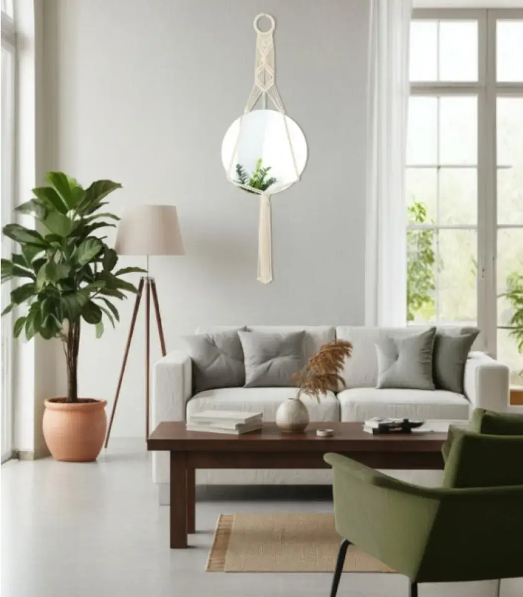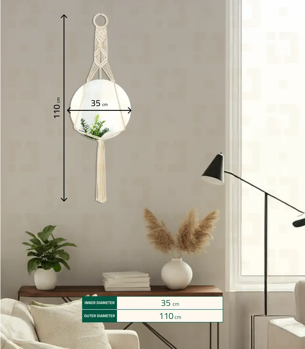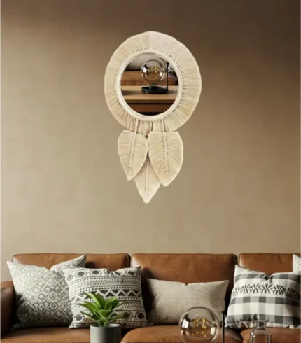 مرآة مكرمية من براند خيوط مصنوعة يدويًا باستخدام الألياف وزجاج، بتصميم حديث مميز ولون ابيض أنيق. تضيف لمسة طبيعية وفنية لغرفة النوم أو المعيشة. مناسبة لمساحات بمقاس 35×110 سم.