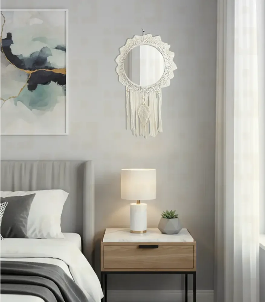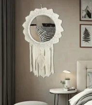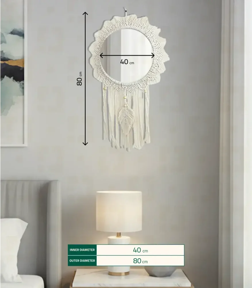 مرآة مكرمية من براند خيوط مصنوعة يدويًا باستخدام الألياف وزجاج، بتصميم بوهيمي مميز ولون ابيض أنيق. تضيف لمسة طبيعية وفنية لغرفة النوم أو المعيشة. مناسبة لمساحات بمقاس 40×80 سم.