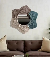 مرآة مكرمية من براند خيوط مصنوعة يدويًا باستخدام الألياف وزجاج، بتصميم حديث مميز و متعددة الالوان المميزة. تضيف لمسة طبيعية وفنية لغرفة النوم أو المعيشة. مناسبة لمساحات بمقاس 25×40 سم.