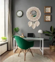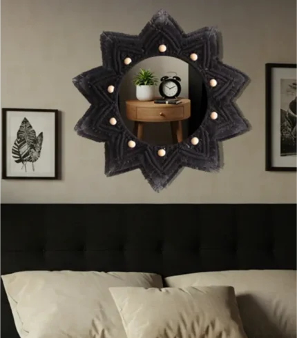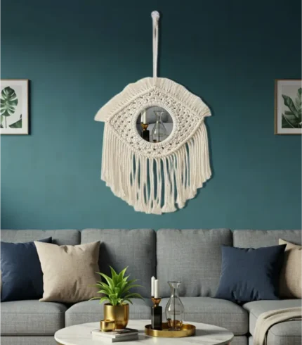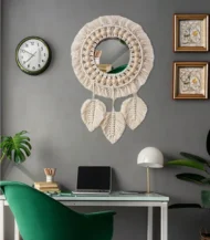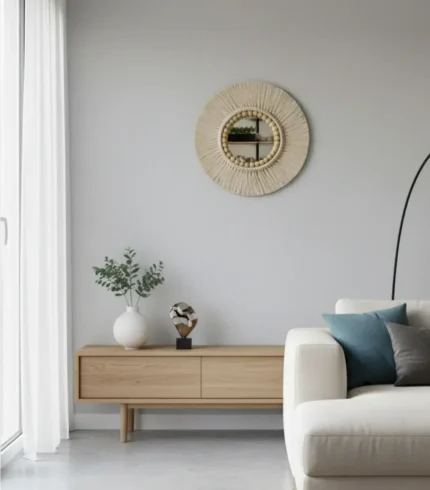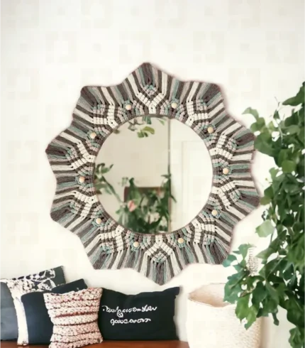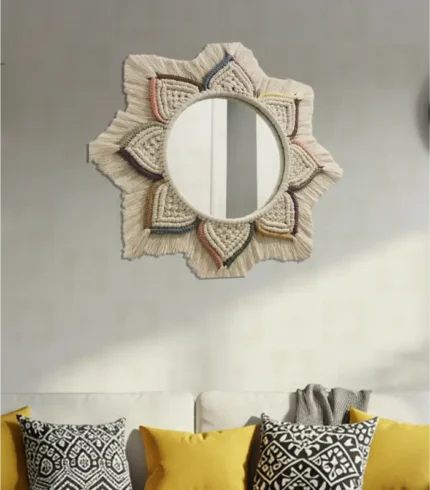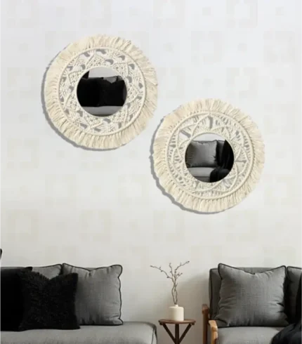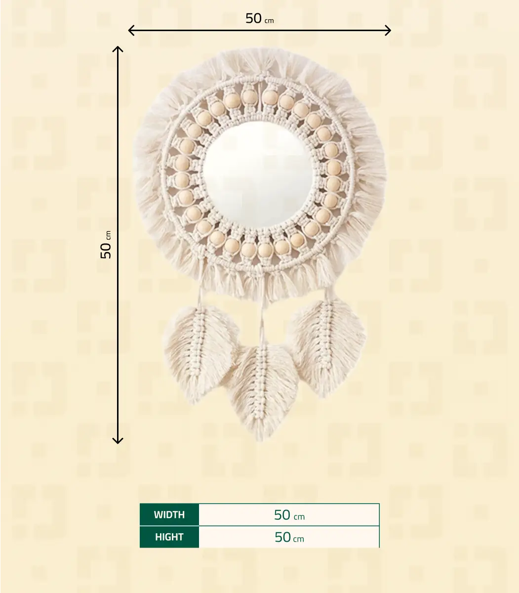 مرآة مكرمية من براند أنتيكيانو مصنوعة يدويًا باستخدام الألياف وزجاج، بتصميم ريفي، حديث، بوهيمي، كلاسيكي، بسيط مميز ولون اوف وايت أنيق. تضيف لمسة طبيعية وفنية لغرفة النوم أو المعيشة. مناسبة لمساحات بمقاس 50×50 سم.