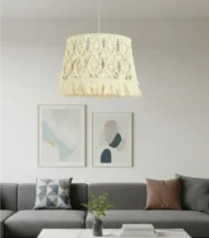 أضف لمسة من الأناقة إلى منزلك مع مصباح سقف مكرميه من الشيخ سعد. مصنوع يدويًا من الألياف والمعادن، بتصميم بوهيمي أنيق ولون اوف وايت جذاب وبمقاس 50*35 سم. يجمع بين البساطة والفخامة ليمنح منزلك لمسة من السحر والجمال.