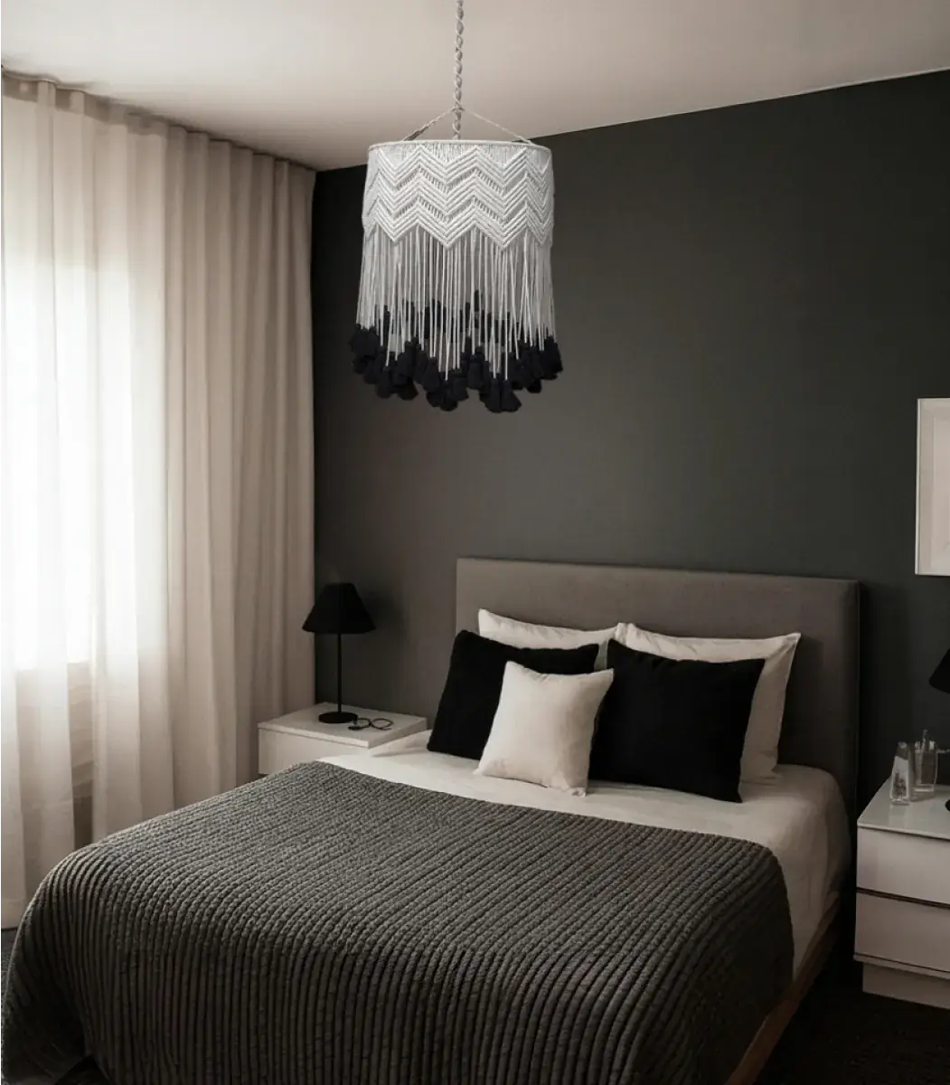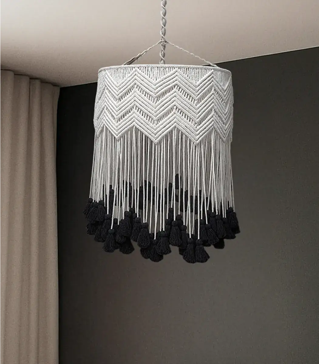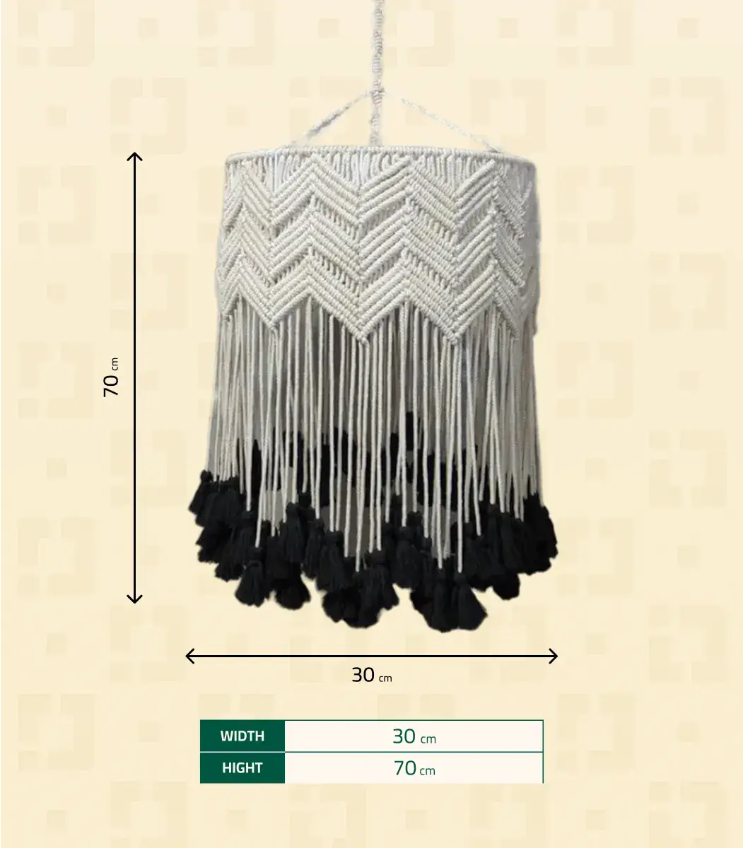 اكتشف سحر نجفة المكرمية من براند HMK. مصنوعة من الألياف والمعادن عالية الجودة، بتصميم ريفي، حديث، بوهيمي أنيق، وباللون اوف وايت، تضيف لمسة دافئة وطبيعية لمساحتك. بمقاس 70×30 سم.