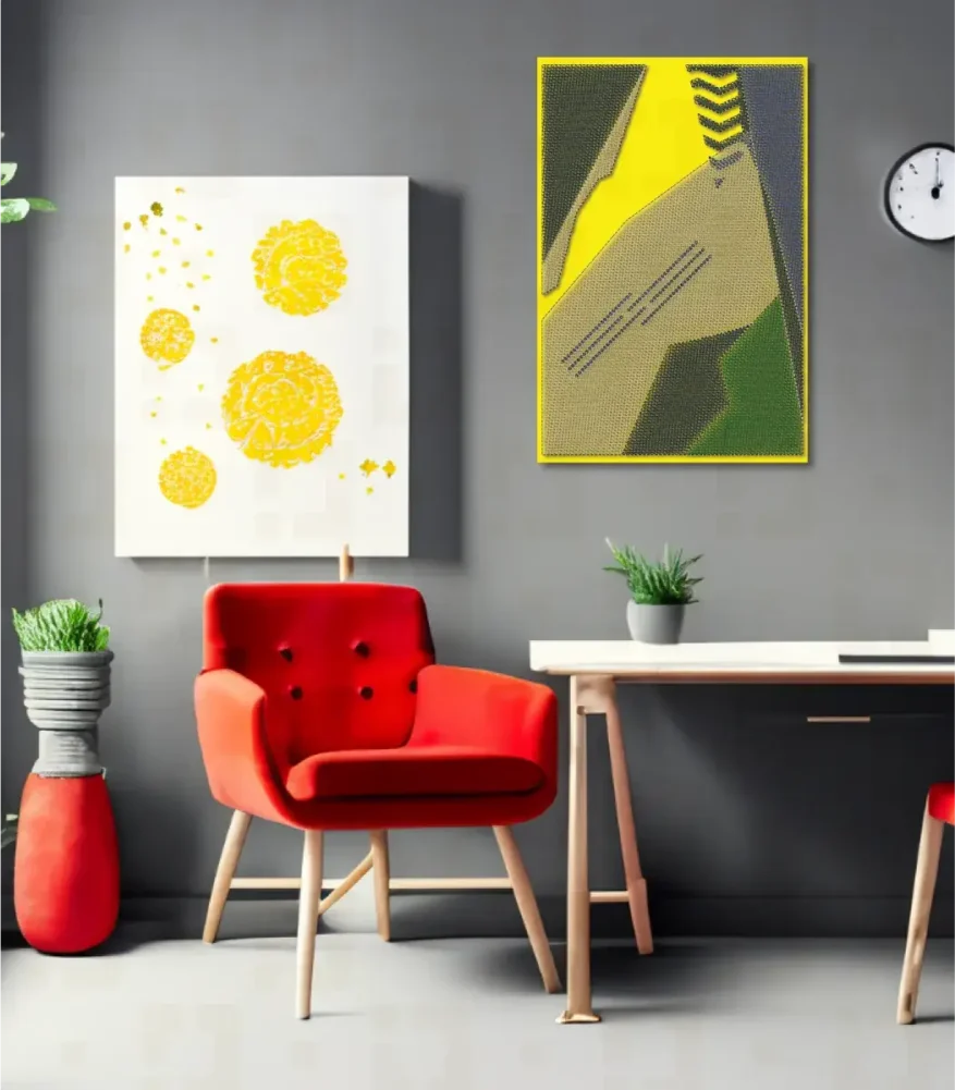 فن الخيوط الإبداع الأشكال السريالية، فن معاصر مصنوع يدوياً، لوحة فنية للحائط بتصميم نسيج الأحلام السريالية باستخدام مواد خام عالية الجودة، متوفر بألوان احمر و اصفر و ازرق.