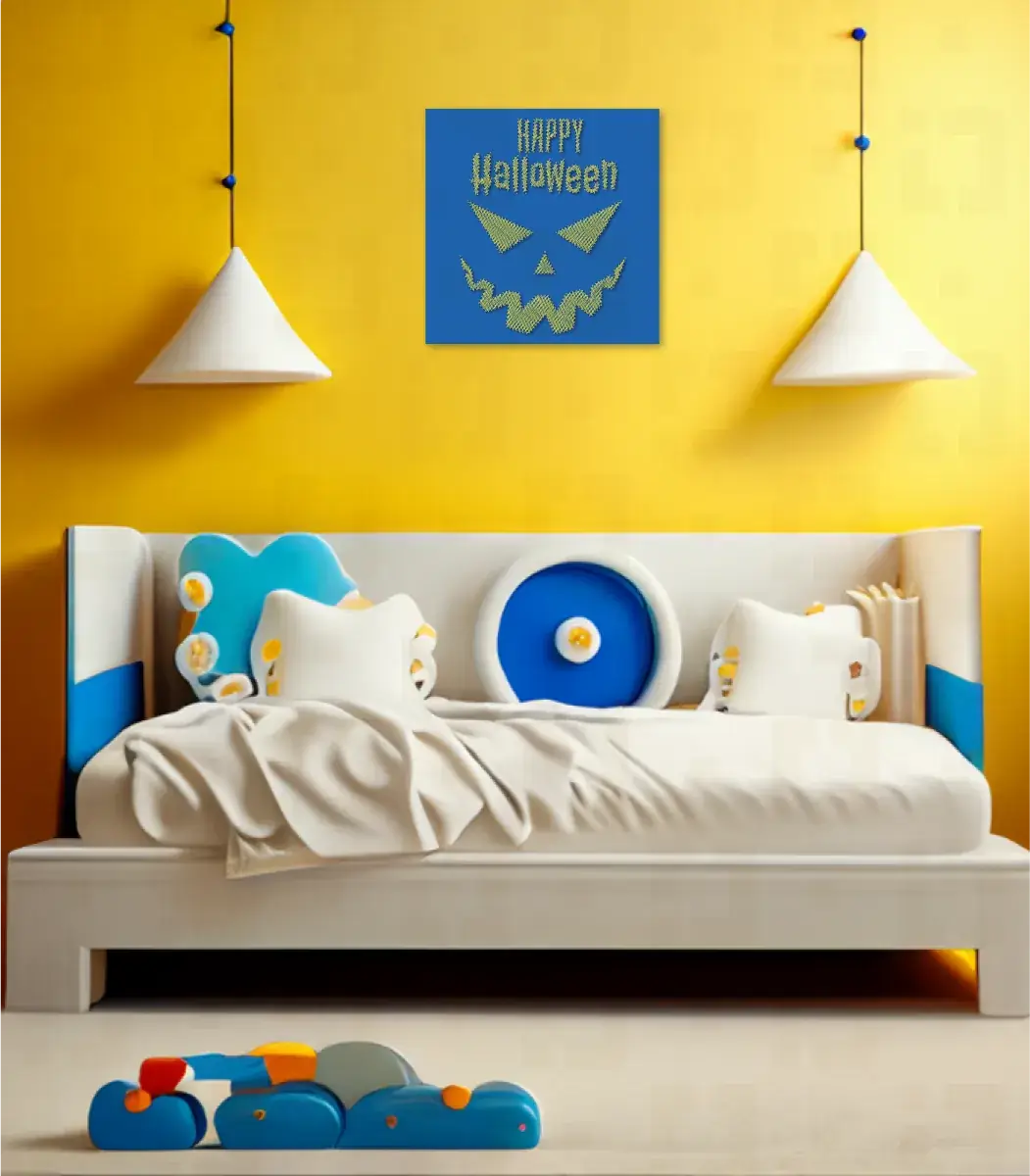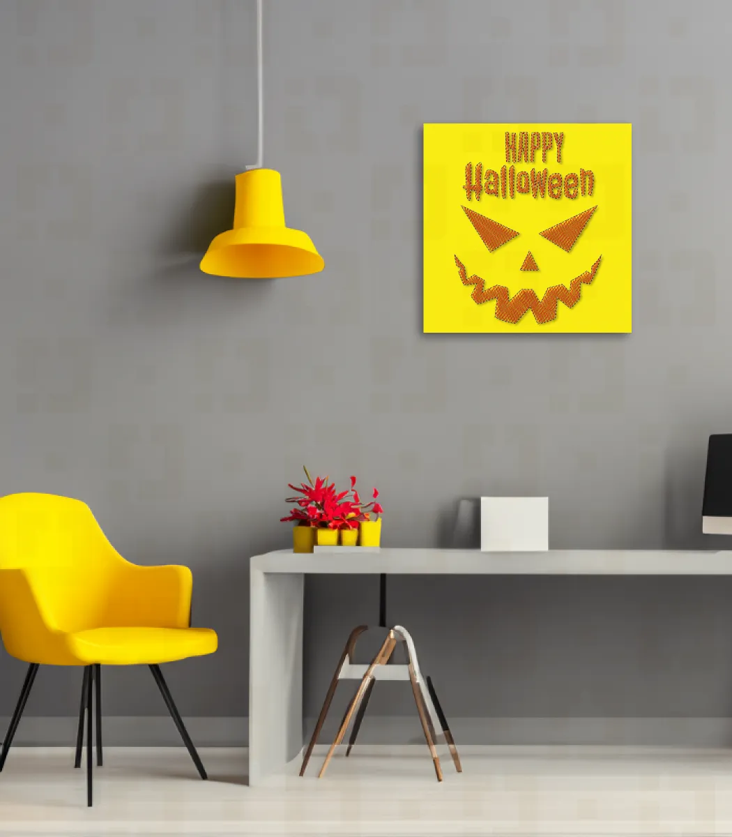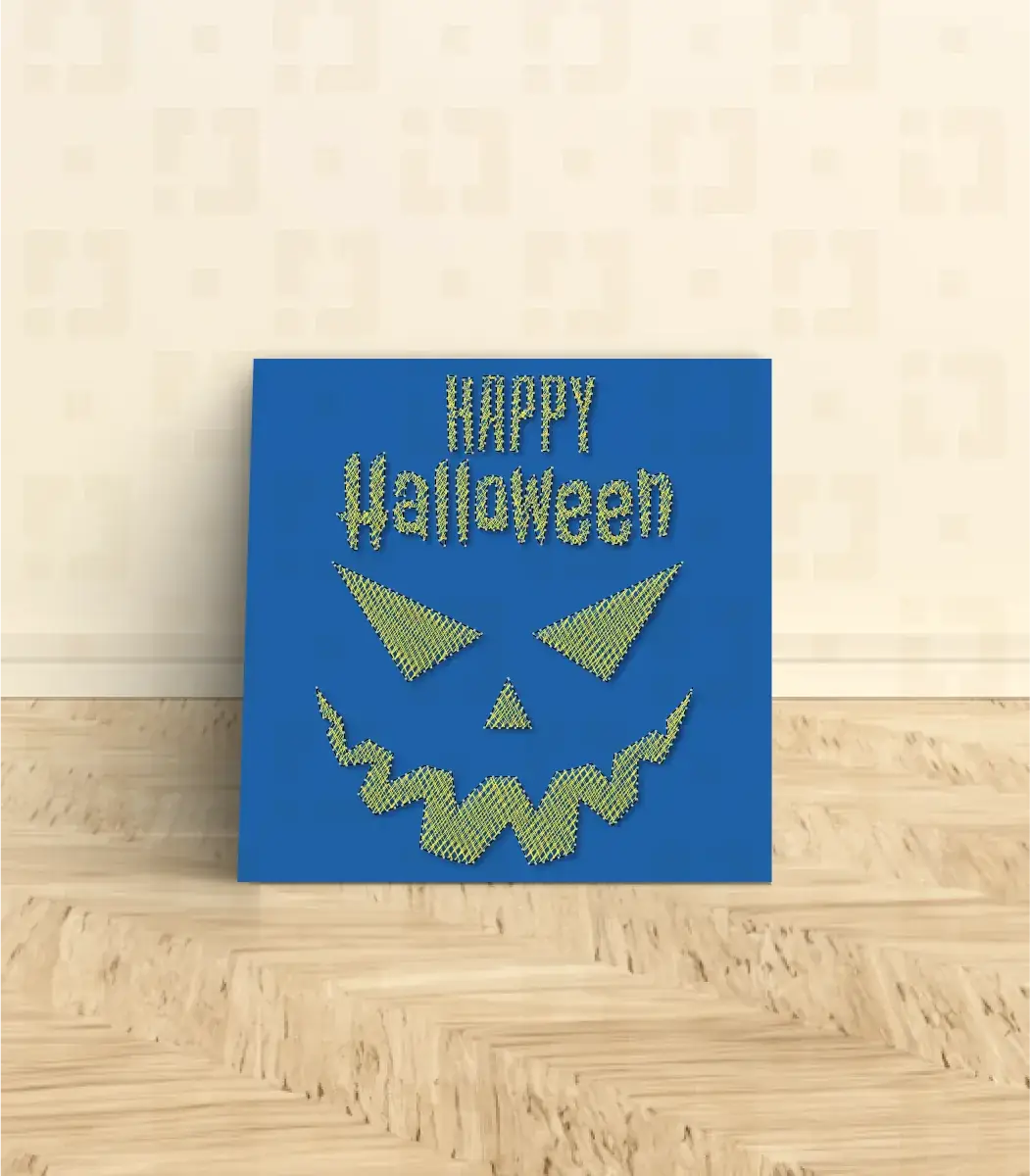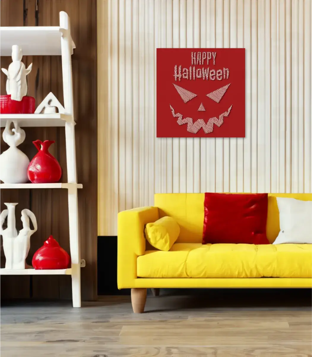 فن الخيوط المناسبات عيد الهالوين، فن معاصر مصنوع يدوياً، لوحة فنية للحائط بتصميم وجه الهالوين باستخدام مواد خام عالية الجودة، متوفر بألوان احمر و ازرق و اصفر.