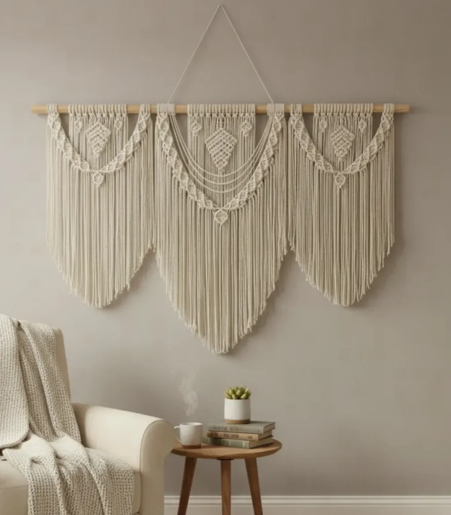 أنتيكيانو بتخلي الفن جزء من بيتك مع ديكورات حائط مكرمية handmade الجميل. مصنوع يدويًا من الألياف والخشب الطبيعي بلون متعدد الألوان ناعم يعبّر عن البساطة والفخامة. مش مجرد ديكور، دي قطعة بتحكي عنك وعن ذوقك.
