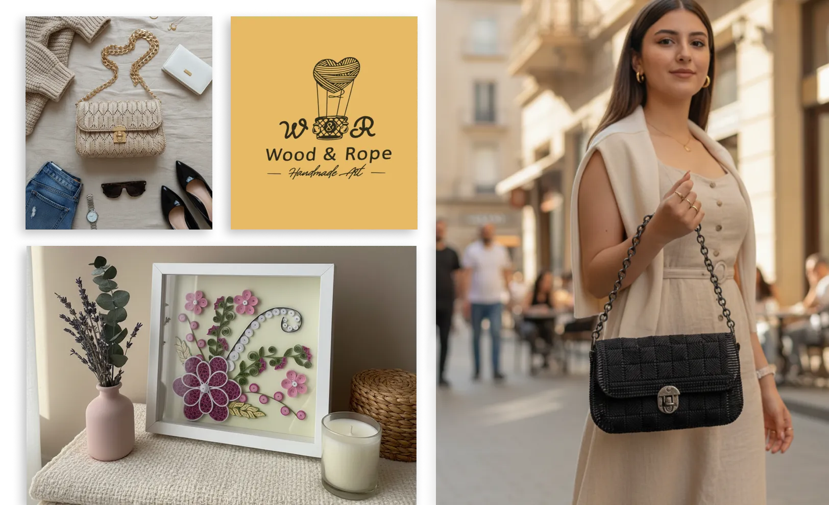 تضيف WOOD & ROPE لمسة دافئة وفنية إلى الإبداعات اليدوية. من حقائب الكروشيه إلى الأكواب وإطارات الحائط الصغيرة، كل قطعة تُصنع بشغف لتجمع بين البساطة، الجمال، والأناقة الطبيعية في كل تفصيلة