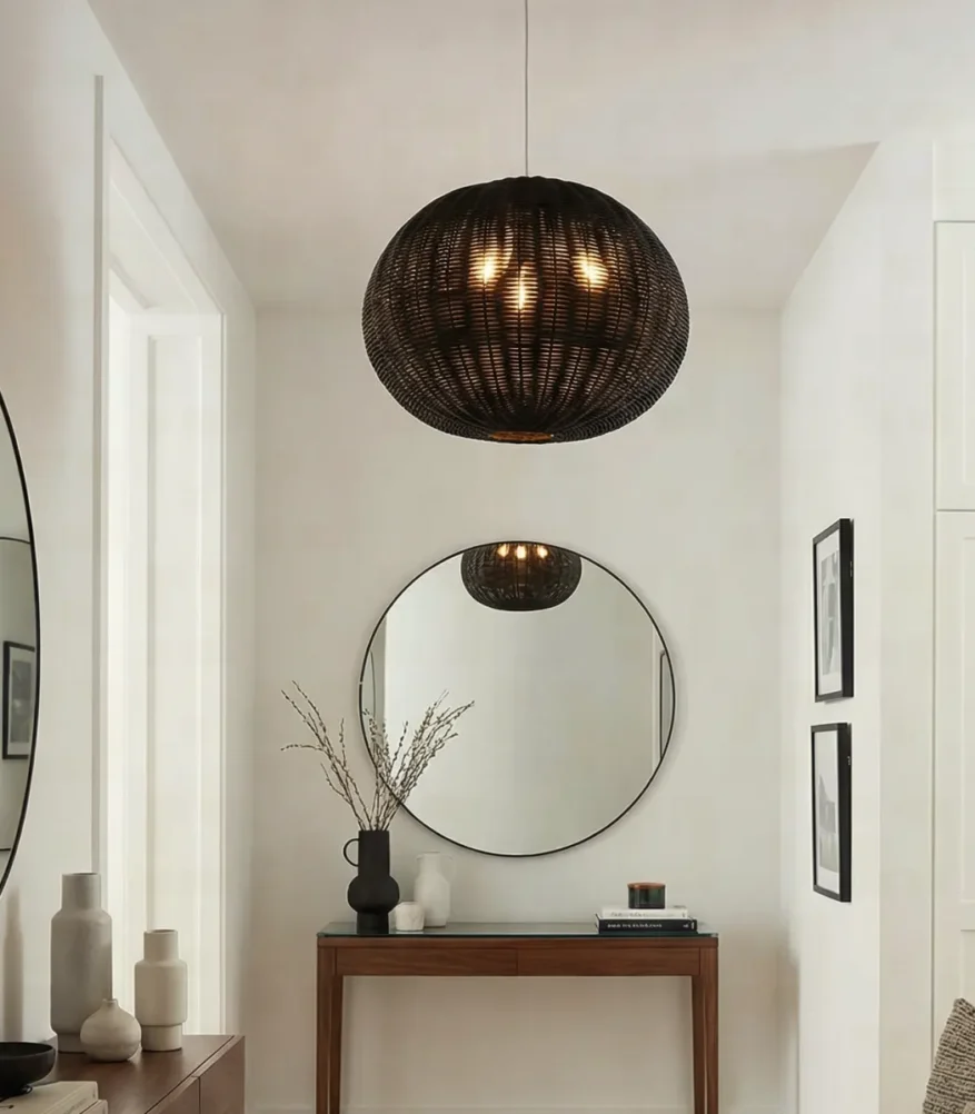 A stylish ceiling pendant light made from natural Bambo , featuring a simple geometric design that brings warmth and character to any room. The open-weave structure allows light to diffuse softly, creating a cozy and inviting atmosphere — perfect for living rooms, bedrooms, or boho-inspired cafés.