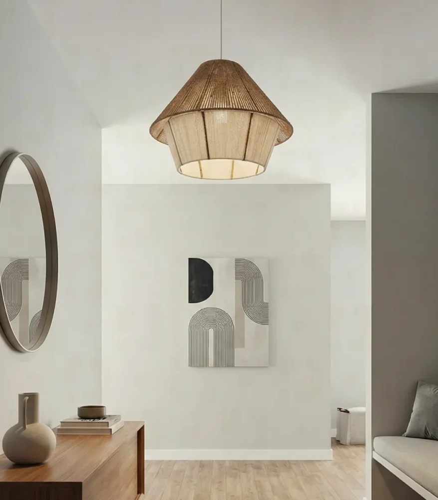 A stylish ceiling pendant light made from natural jute rope, featuring a simple geometric design that brings warmth and character to any room. The open-weave structure allows light to diffuse softly, creating a cozy and inviting atmosphere — perfect for living rooms, bedrooms, or boho-inspired cafés.