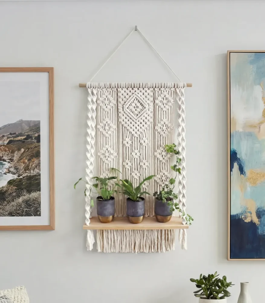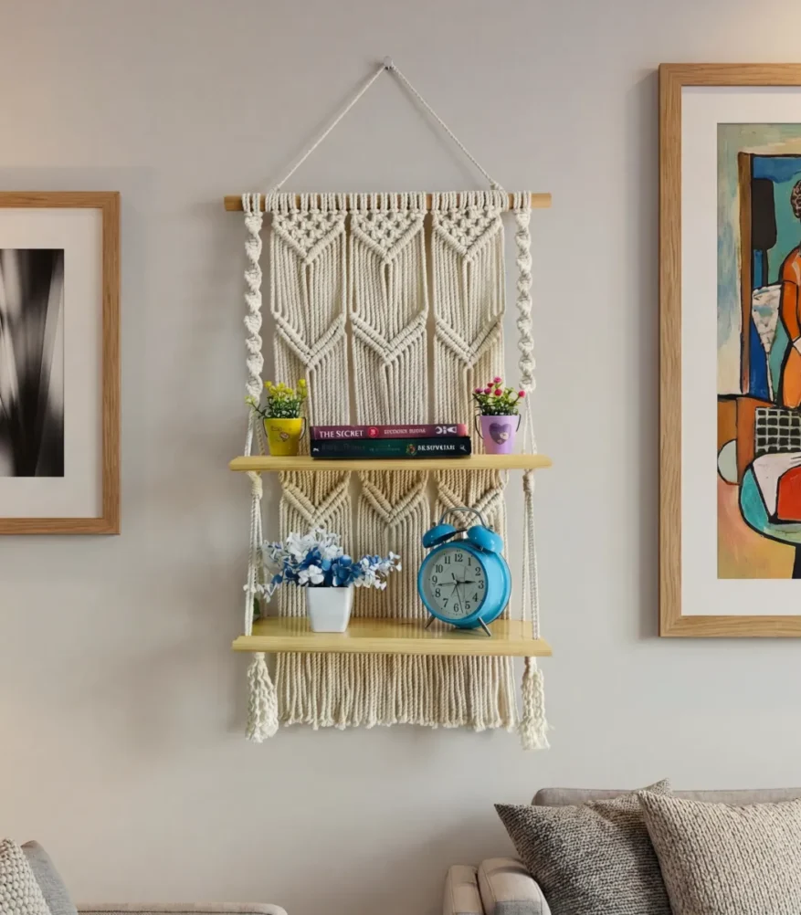 Add a touch of personality to your wall with this handmade Macrame Shelf from the Home Accessories brand. Made of high-quality Fiber, Wood in a stylish Bohemian design, its elegant Beige finish suits a variety of interiors. Perfect for living rooms, bedrooms, or entryways, this piece brings artisanal charm and natural beauty to any space. Fits beautifully in areas measuring 90×60 cm.