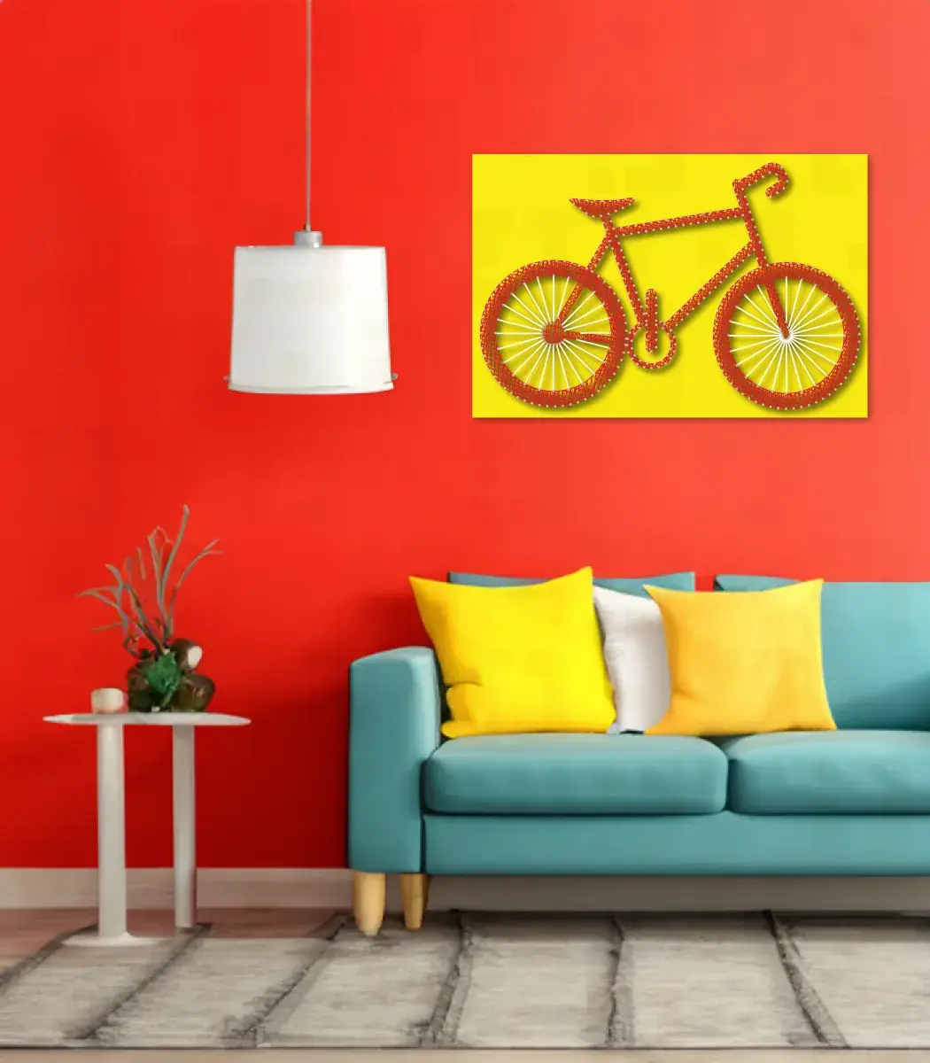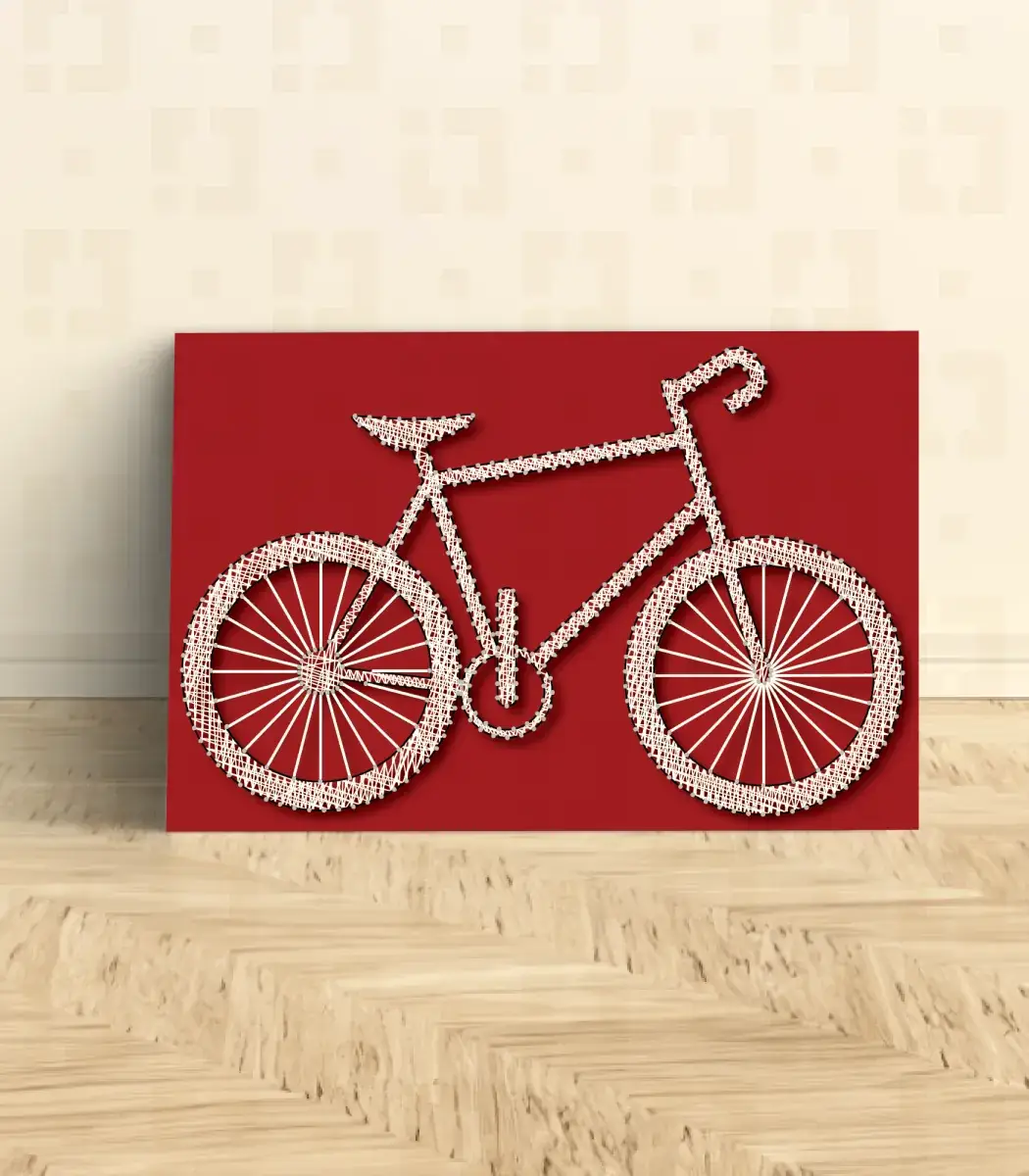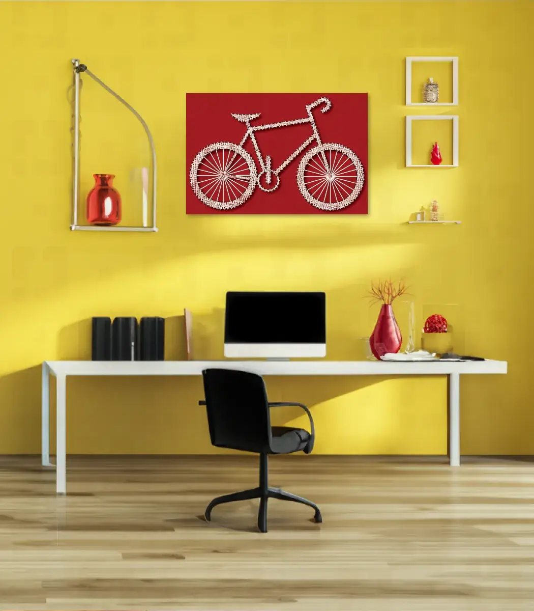 String art creative elements, Contemporary art handmade, Bike Inspired string art wall decor using very high quality materials, Available in gray, red and yellow.
