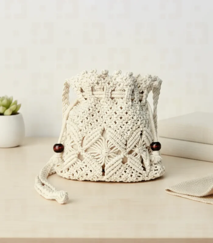 Elevate your boho look with the Gray Macrame bags from Jungle. Crafted in a bohemian style using premium fiber, this bag is perfect for relaxed yet chic outings. Comes in size 25*30*3 cm