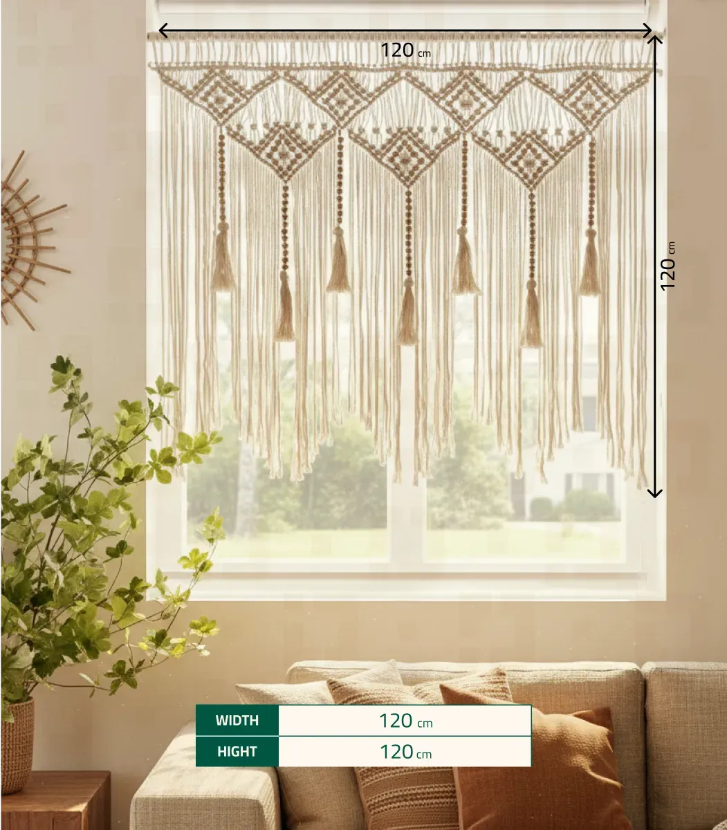 Elevate your interiors with the Macrame Curtain in Bohemian style. Handcrafted from Fiber, finished in Off white, size 120*120 Cm, by SHababik. A timeless piece to add warmth and charm to your home.