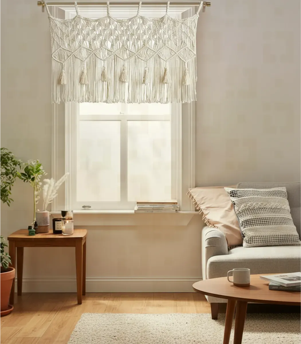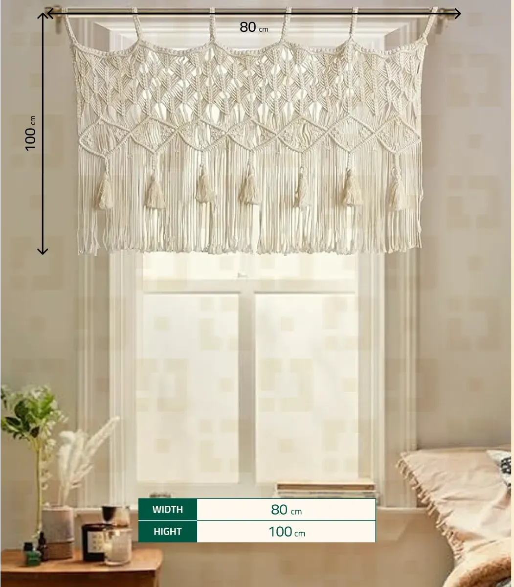 Elevate your interiors with the Macrame Curtain in Bohemian style. Handcrafted from Fiber, finished in Off white, size 80*100 Cm, by SHababik. A timeless piece to add warmth and charm to your home.
