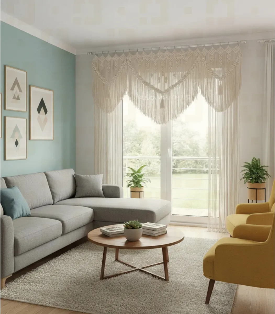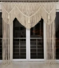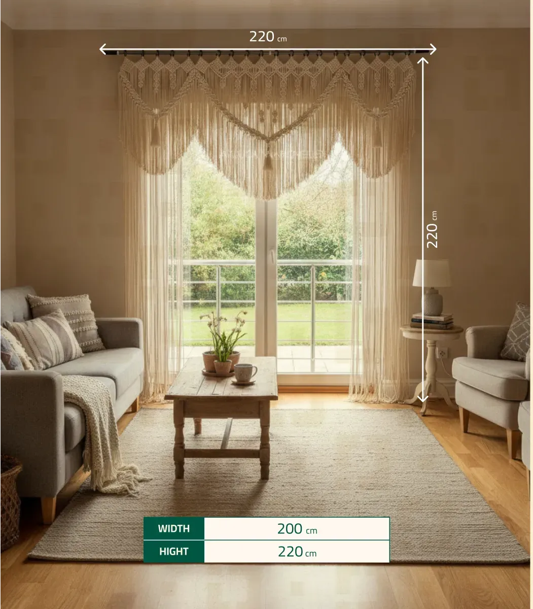 Elevate your interiors with the Macrame Curtain in Bohemian style. Handcrafted from Fiber, finished in Off white, size 220*200 Cm, by Zigara. A timeless piece to add warmth and charm to your home.