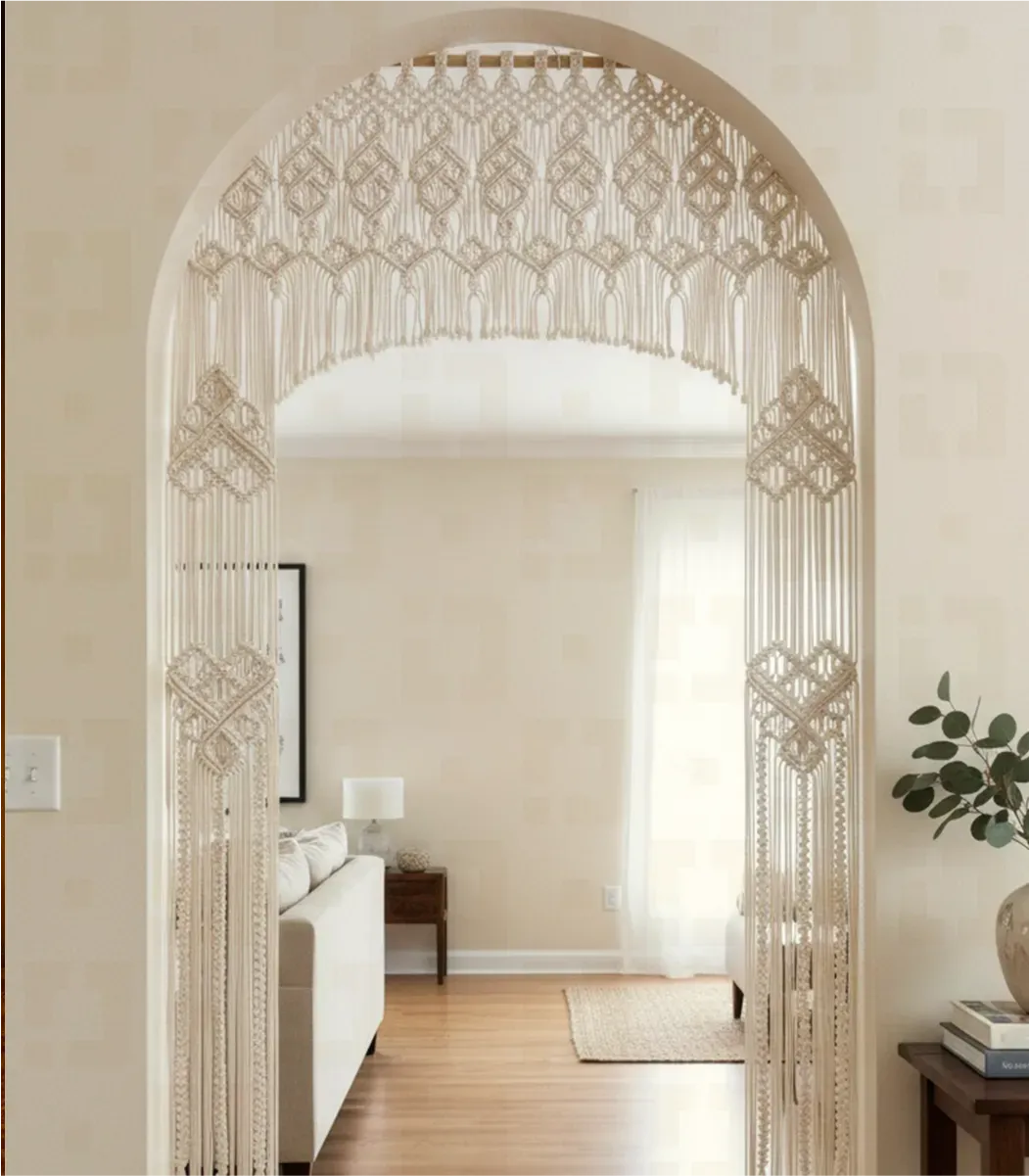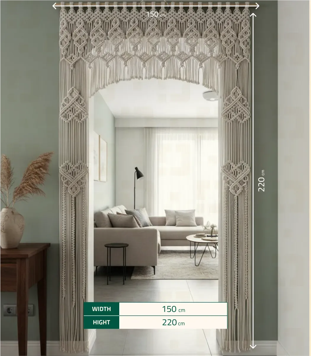 Elevate your interiors with the Macrame Curtain in Bohemian style. Handcrafted from Fiber, finished in Off white, size 220*150 Cm, by Zigara. A timeless piece to add warmth and charm to your home.