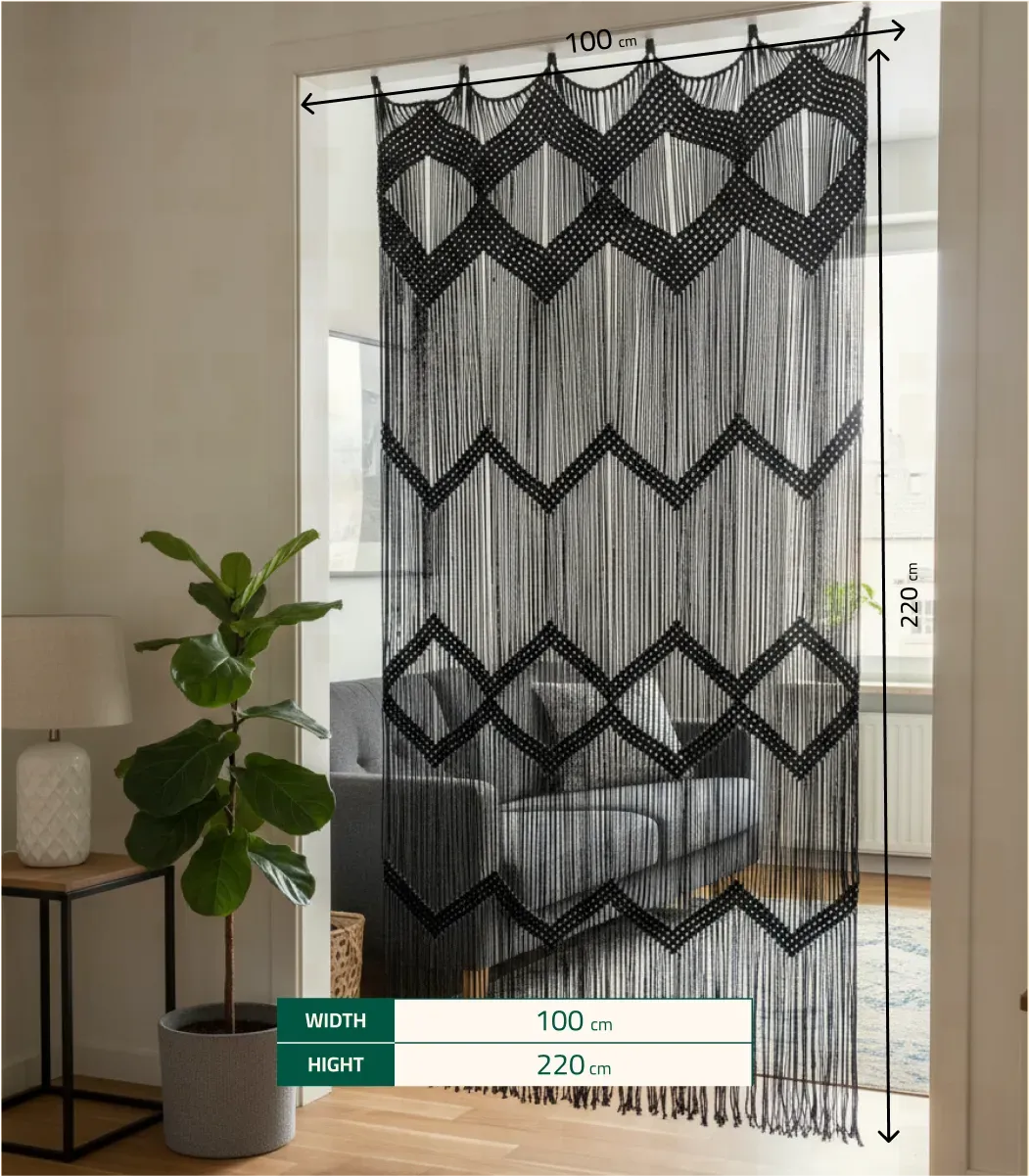 Elevate your interiors with the Macrame Curtain in Bohemian style. Handcrafted from Fiber, finished in Black, size 220*100 Cm, by SHababik. A timeless piece to add warmth and charm to your home.