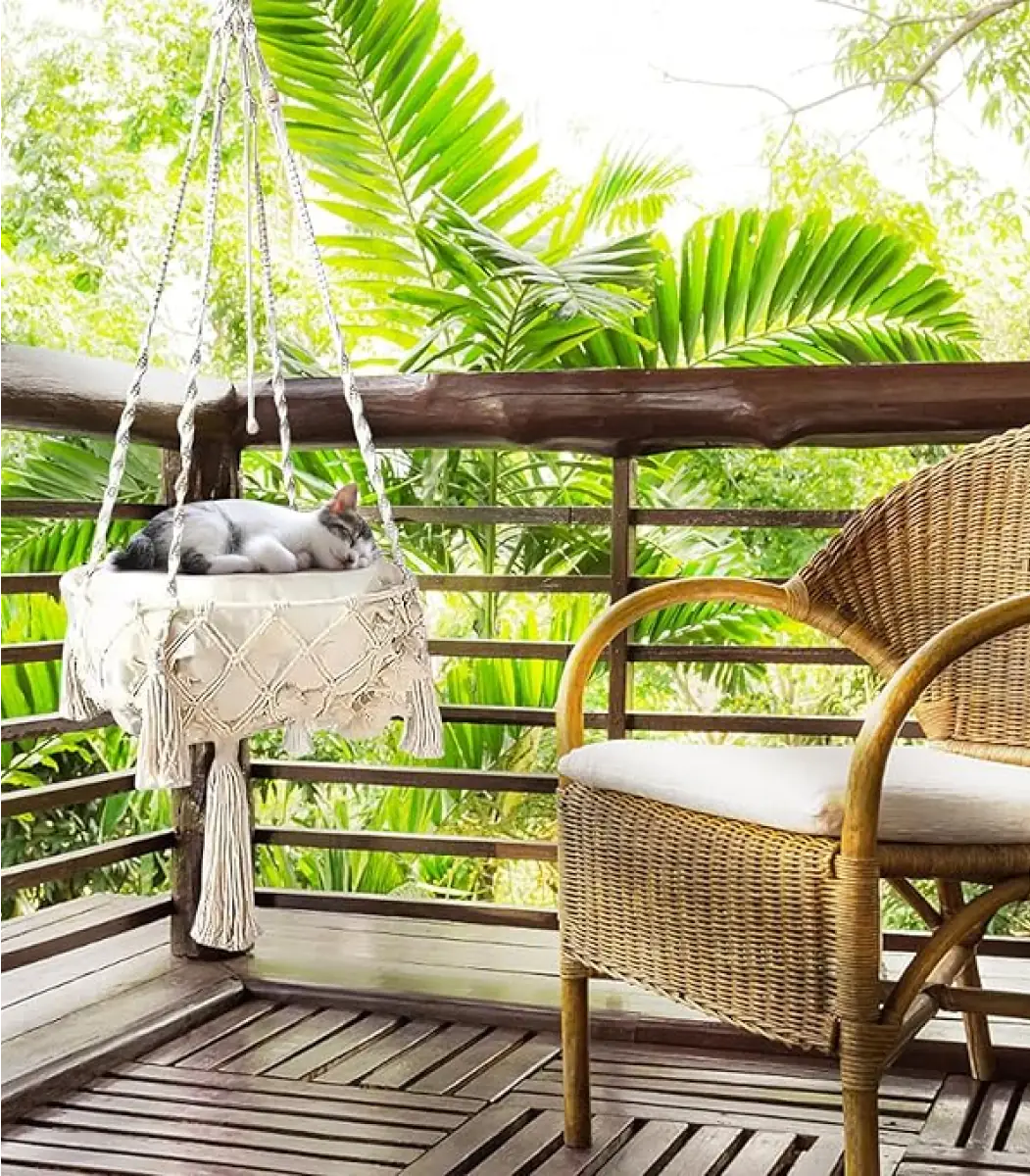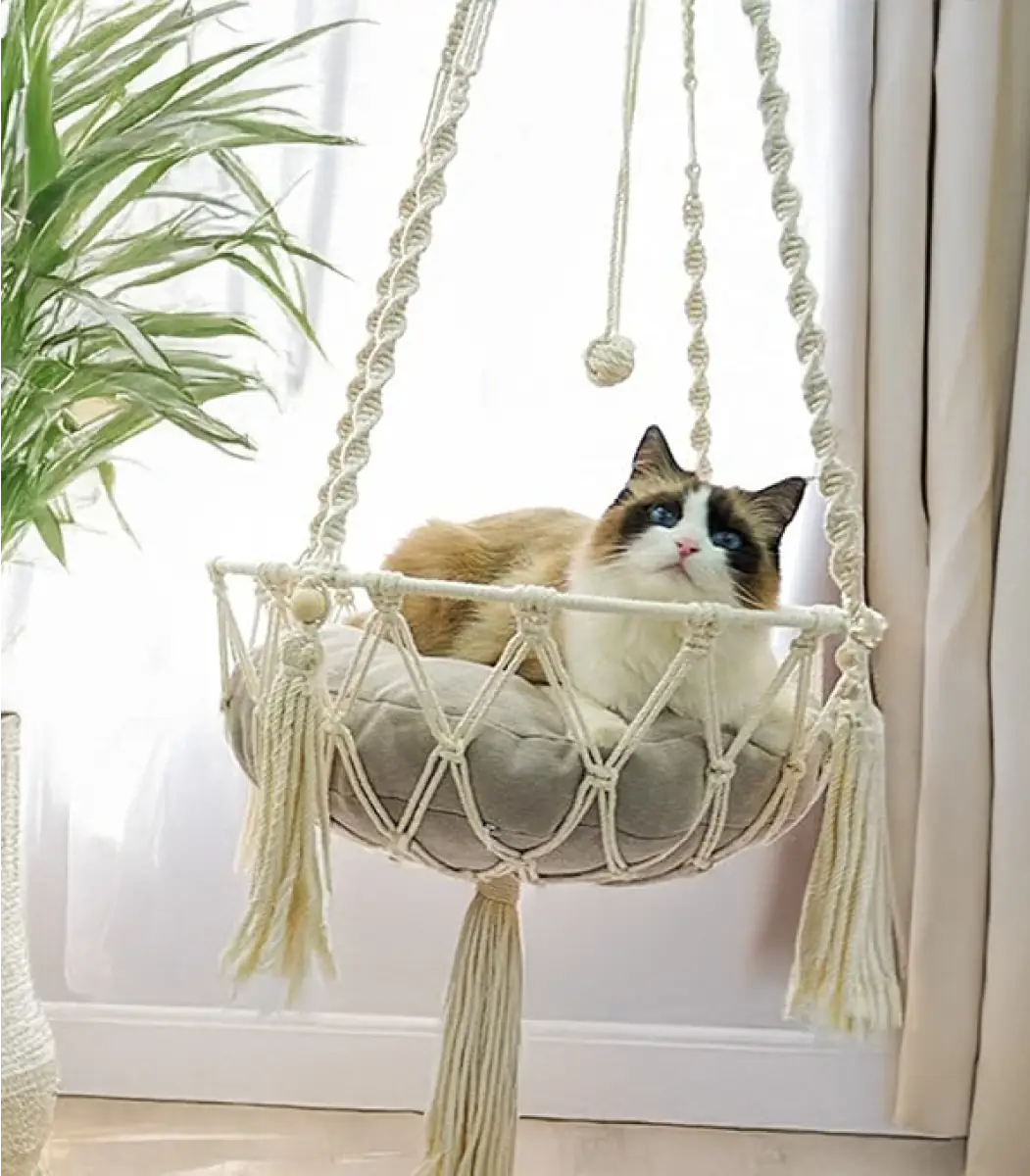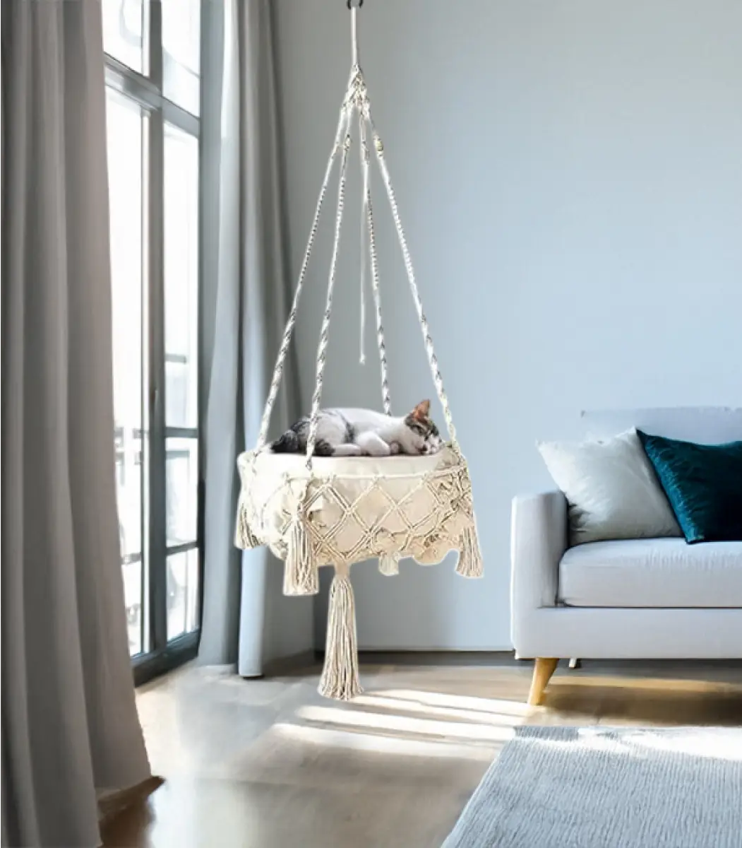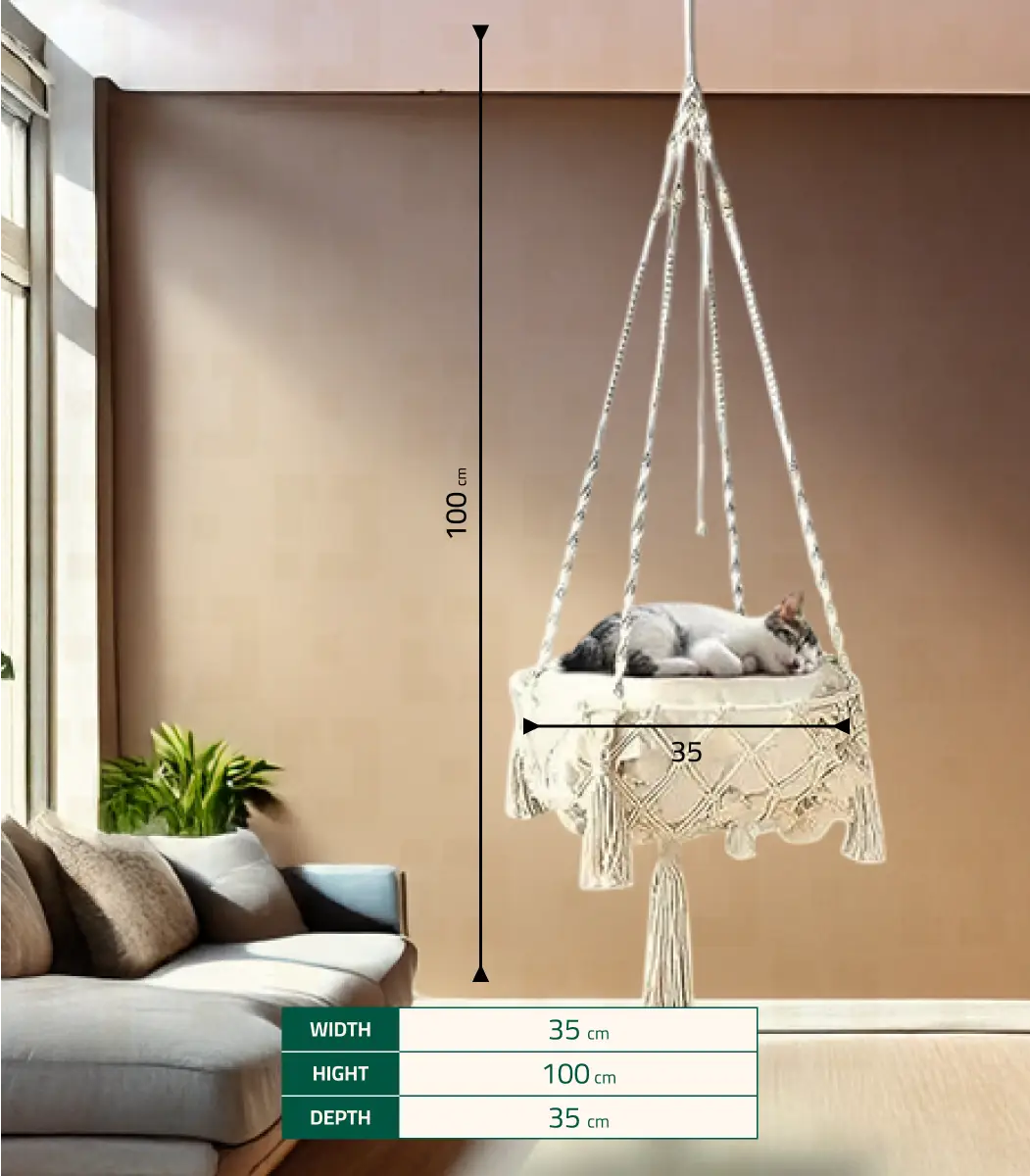 Enhance your pet’s comfort with the Macrame Hanging Cat Hammock from Khoyot, crafted from Fiber, Metal in a charming Off White finish, measuring 100 x 35 x 35 Cm, featuring a Bohemian design that’s perfect for adding a cozy and stylish touch to any space.