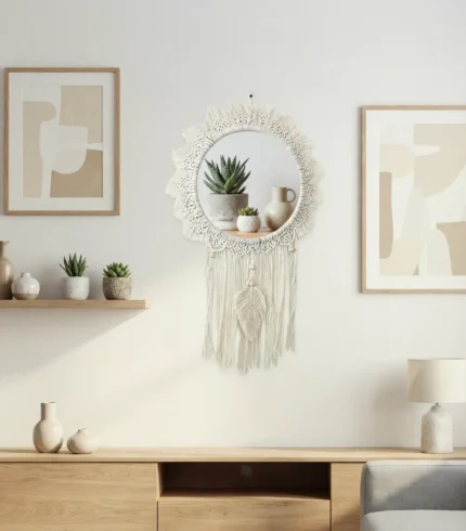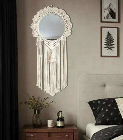 Handcrafted Macrame mirror by Antikiano Brand, made with Fiber, Wood, Glass in a unique Rustic, Modern, Bohemian, Vintage, Minimalist design. This stylish