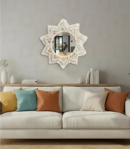 Handcrafted Macrame mirror by Antikiano Brand, made with Fiber, Wood in a unique Rustic, Modern, Bohemian, Vintage, Minimalist design. This stylish Off white wall mirror adds a natural, cozy touch to your bedroom or living room. Perfect for spaces sized 20×20 Cm.