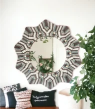 Handcrafted Macrame Mirror by Khoyot Brand, made with Fiber, glass in a unique Bohemian design. This stylish Multicolor wall mirror adds a natural, cozy touch to your bedroom or living room. Perfect for spaces sized 55×40 Cm.