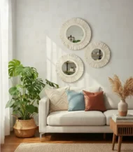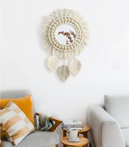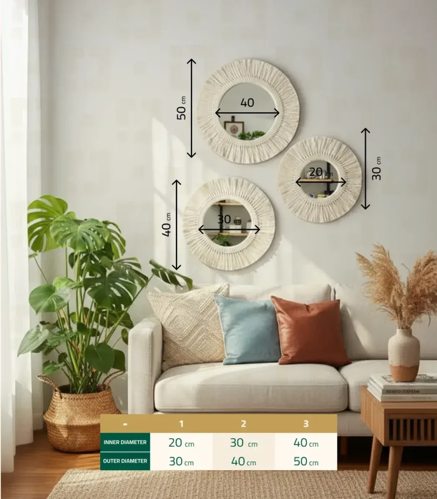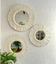 Handcrafted Macrame Mirror 3 pcs by Khoyot Brand, made with Fiber, glass in a unique Bohemian design. This stylish White wall mirror adds a natural, cozy touch to your bedroom or living room. Perfect for spaces sized 50×40 Cm.