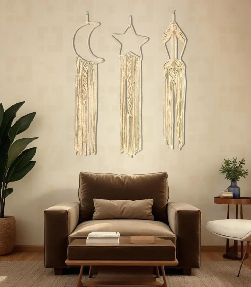 Macrame Ramadan Handmade, From Natural materials, Beige Macrame Moon and Star, From Fiber, Metal, 120*30 CM, Made by Decoro, Fits on Bohemian style, Inspired by unique design for handmade lovers, Using high quality materials that adds a touch of elegance and beauty to any space.