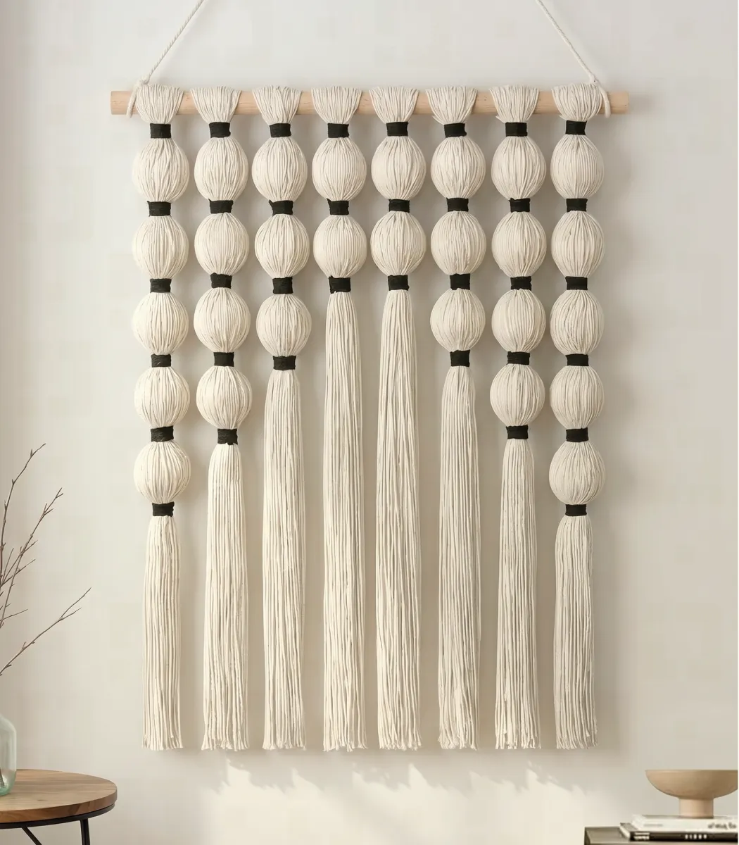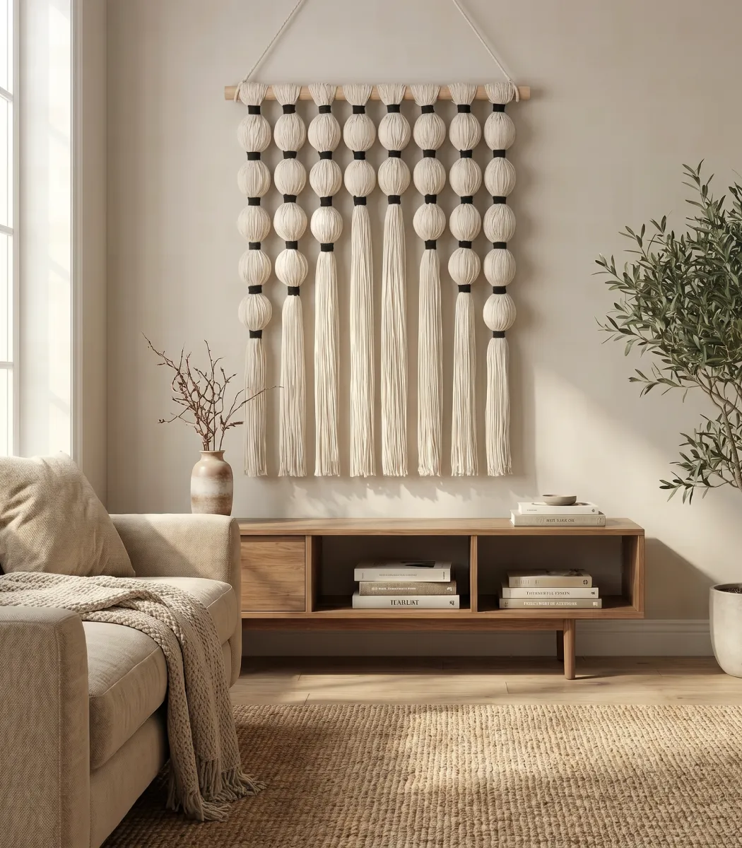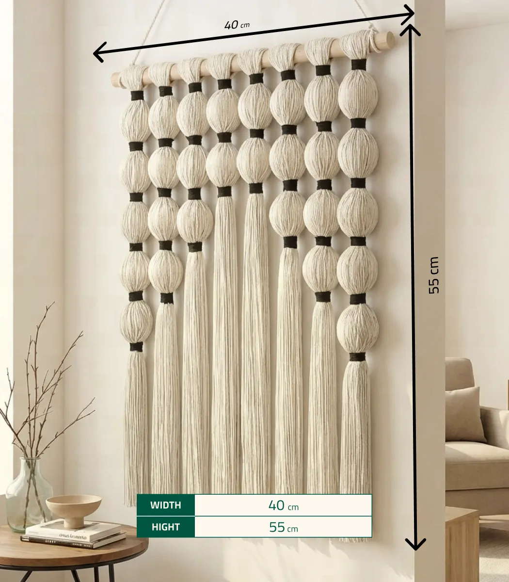 In off-white, everything becomes possible. This Antikiano macramé wall hanging is a study in luminous restraint — fiber and wood intertwined with Bohemian precision into a piece that brings light, texture, and a profound sense of calm to any interior. Hang it where silence meets beauty, and let the craft speak.